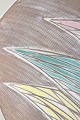 Dekorativ rund skål med let organisk form og indgraveret overflade, håndmalet i geometriske felter i pasteltoner af gul, rosa og turkis på brun baggrund. En klassisk dekoration fra Mari Simmulsons 1950/60’er-produktion, hvor farver og form smelter sammen i et elegant modernistisk udtryk.