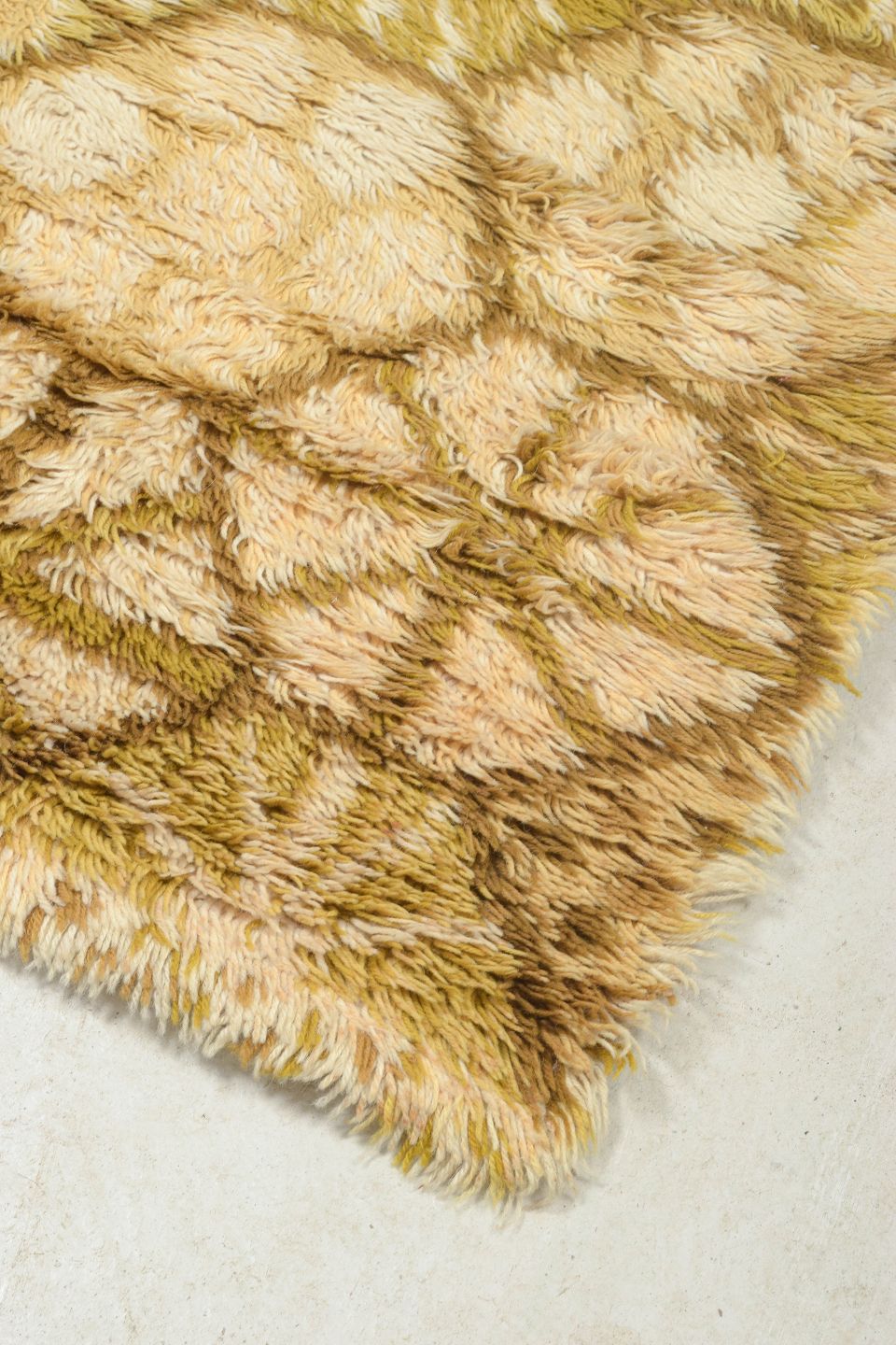 Håndknyttet rya-tæppe i uld designet af Marianne Richter, med geometrisk mønster i gyldne, beige og olivengrønne toner. Et raffineret eksempel på svensk tekstilkunst, hvor modernistiske former kombineres med varme, naturlige farver.