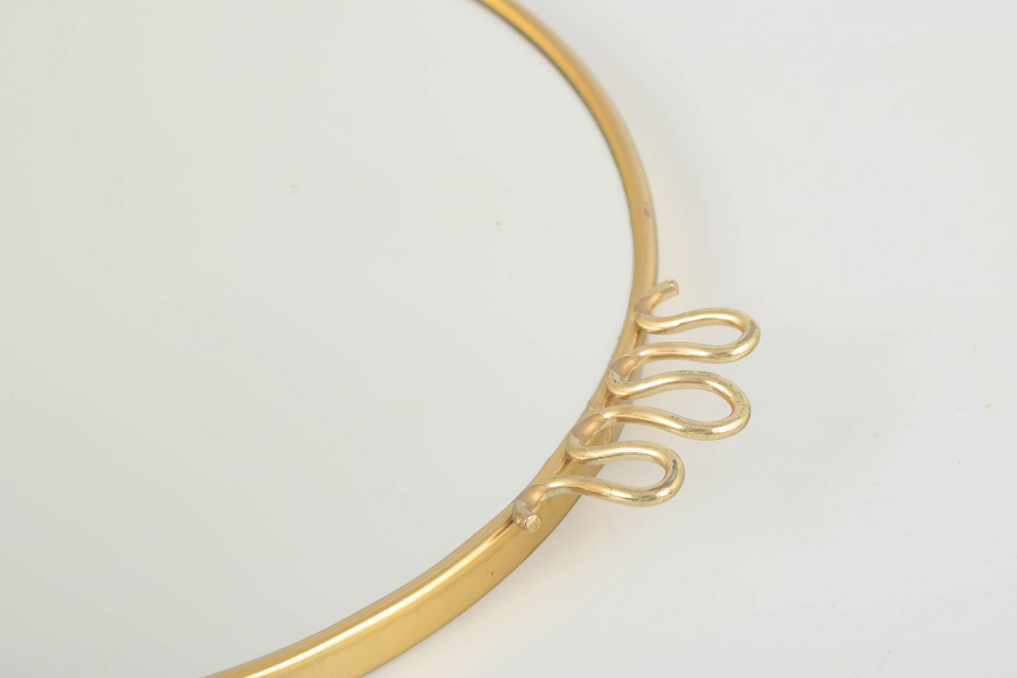 Elegant rund bakke med spejlglas og ramme i poleret messing. De karakteristiske buede håndtag i art deco-inspireret “Swedish Grace”-stil giver et raffineret og klassisk udtryk.