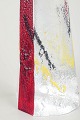 Høj, trekantet art-glass skulptur i klart glas med markant rød indre kerne samt gule og sorte farveindslag. Originalt Johansfors Sweden klistermærke bevaret.