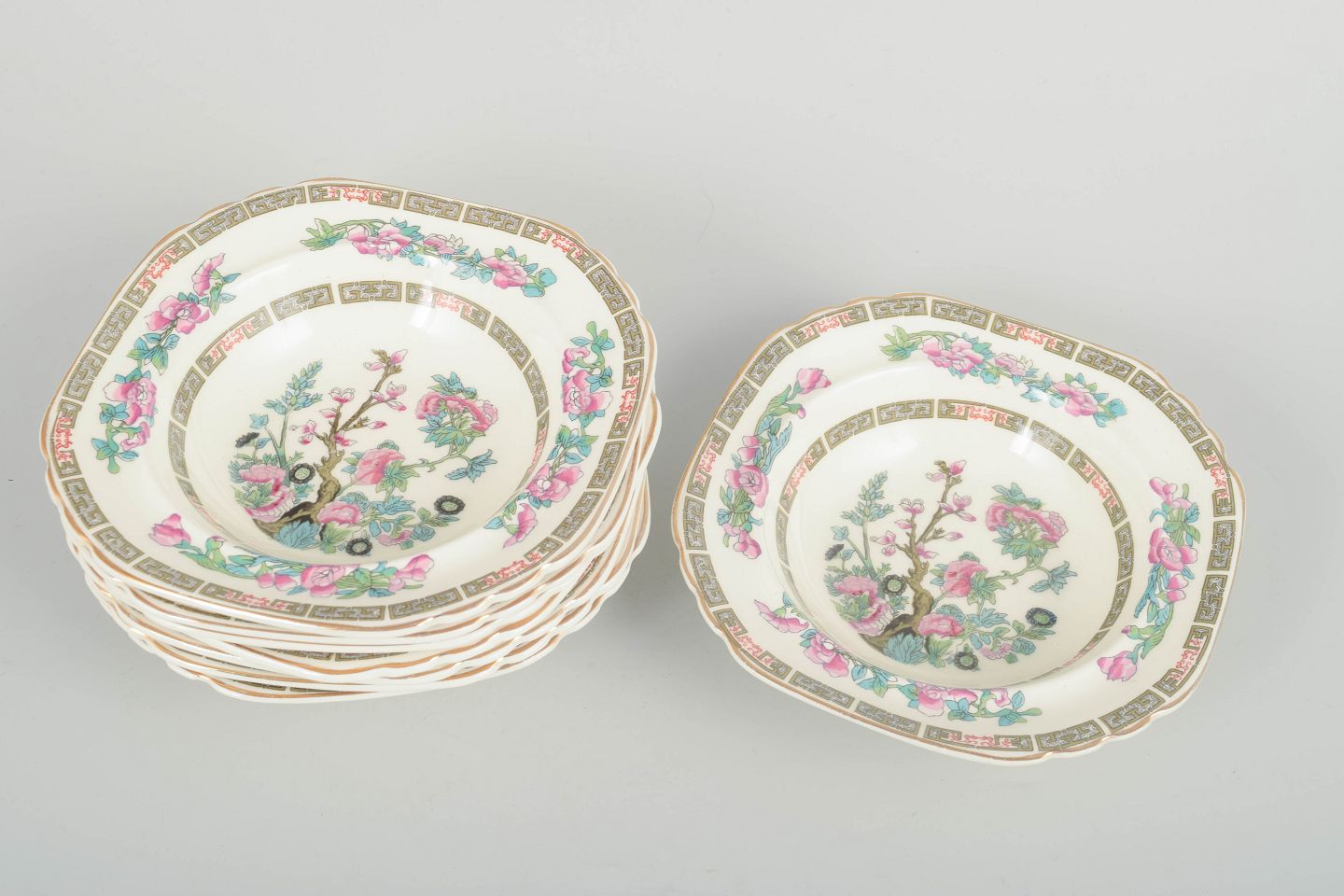Fajance dybe tallerkener med dekorativt orientalsk motiv i flerfarvet transfer, typisk for engelske produktioner inspireret af kinesisk porcelæn.