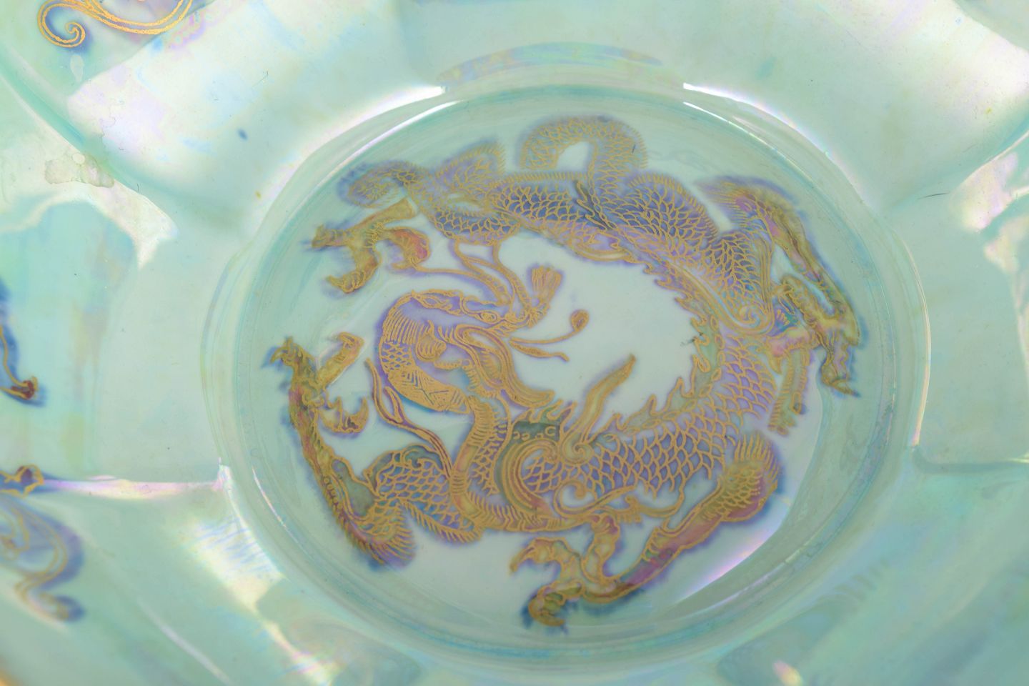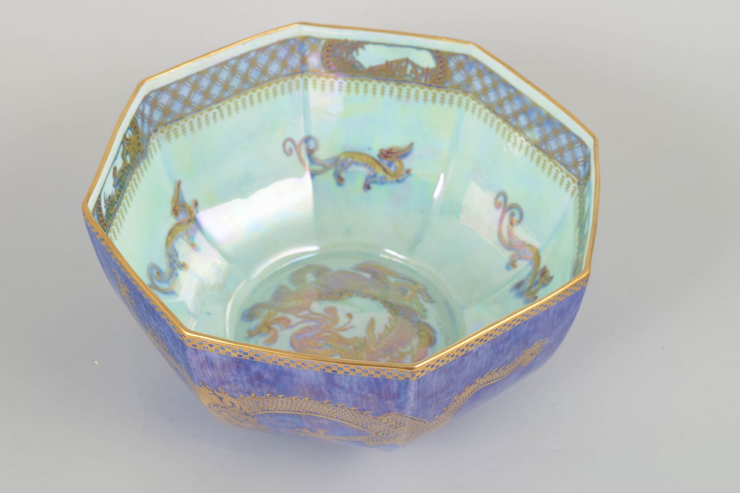 Large octagonal Fairyland Lustre bowl in vivid blue-violet tones with a hand-painted gold dragon and iridescent interior. A quintessential example of Makeig-Jones’ imaginative and opulent lustre ware.