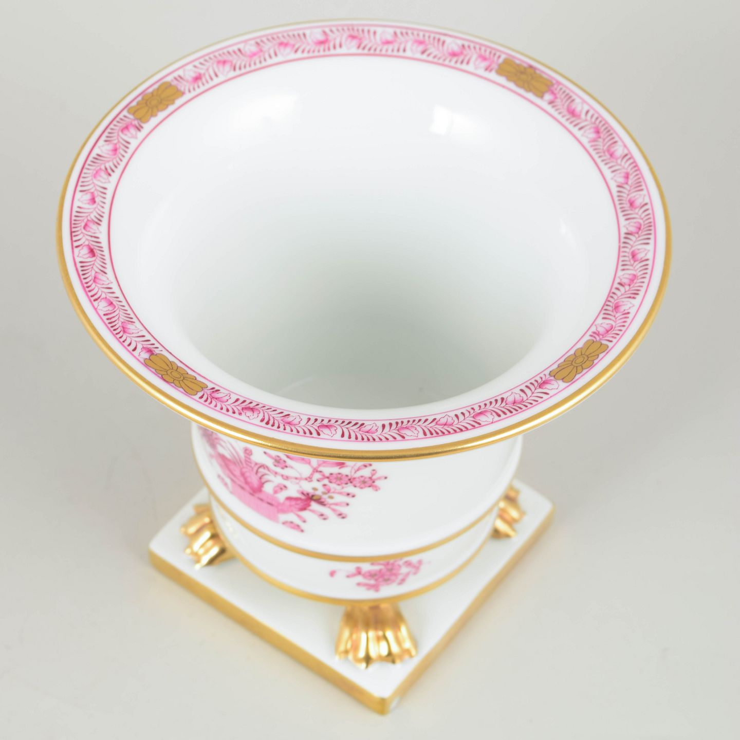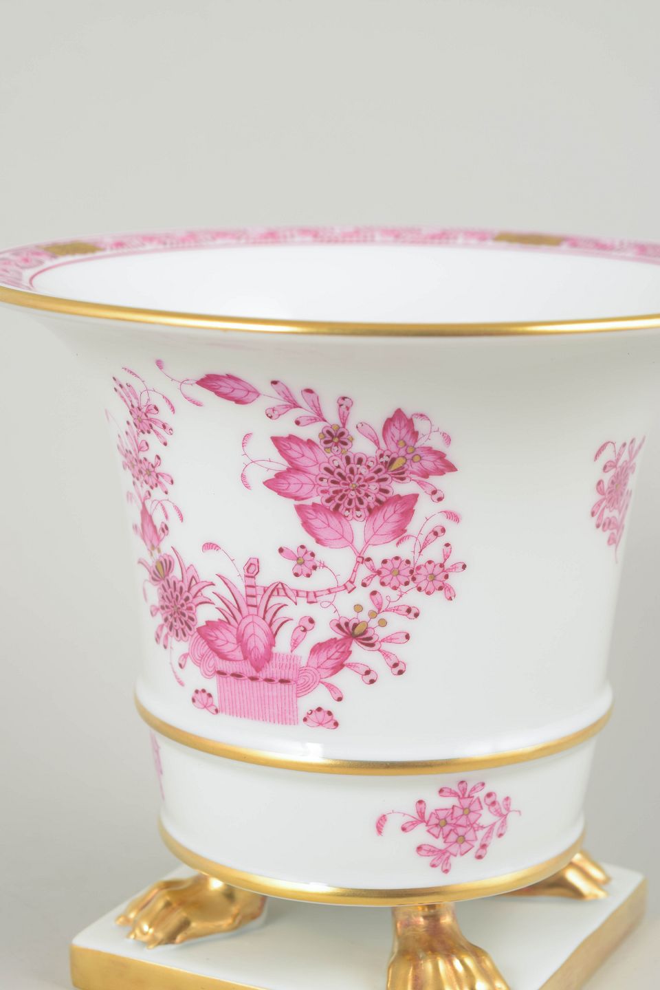 Elegant Herend porcelain pot in white porcelain with hand-painted pink “Indian Basket” decoration and gilded details. The form is classic and flaring, resting on gilt paw feet and a square base.