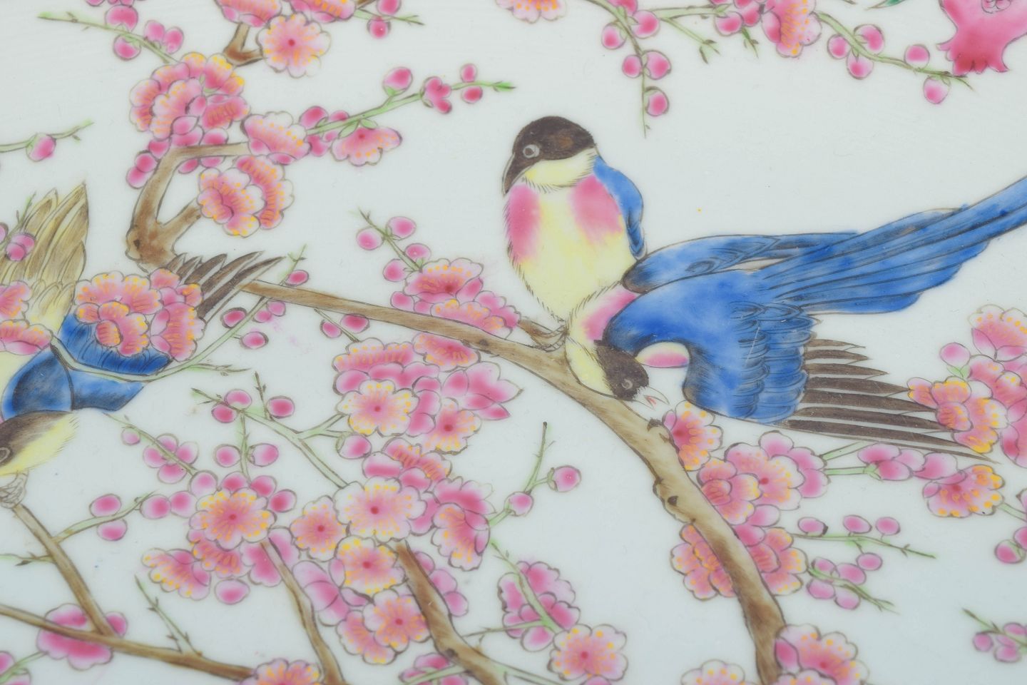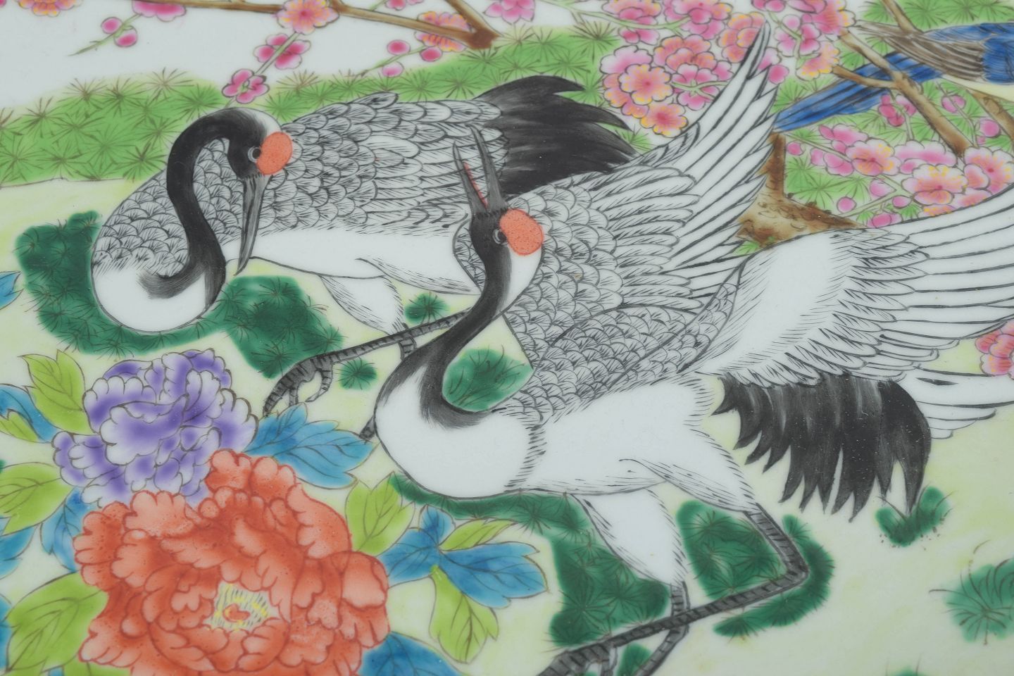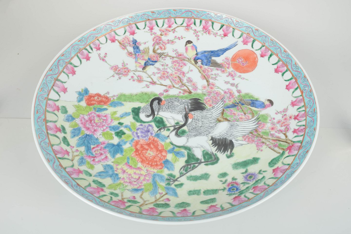 Monumentalt kinesisk fad i porcelæn, rigt håndmalet med farvestrålende fugle, blomstrende træer, traner og solmotiv. Et dekorativt og imponerende stykke med stærk visuel tilstedeværelse.