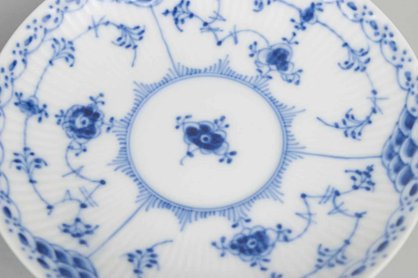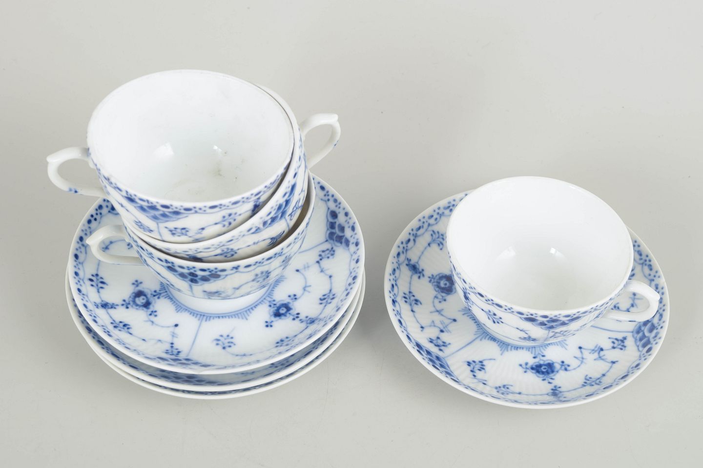 Klassiske halvblonde kopper i håndmalet porcelæn. De fine blå dekorationer og den lette, elegante form gør stellet til et af Royal Copenhagens mest ikoniske.
