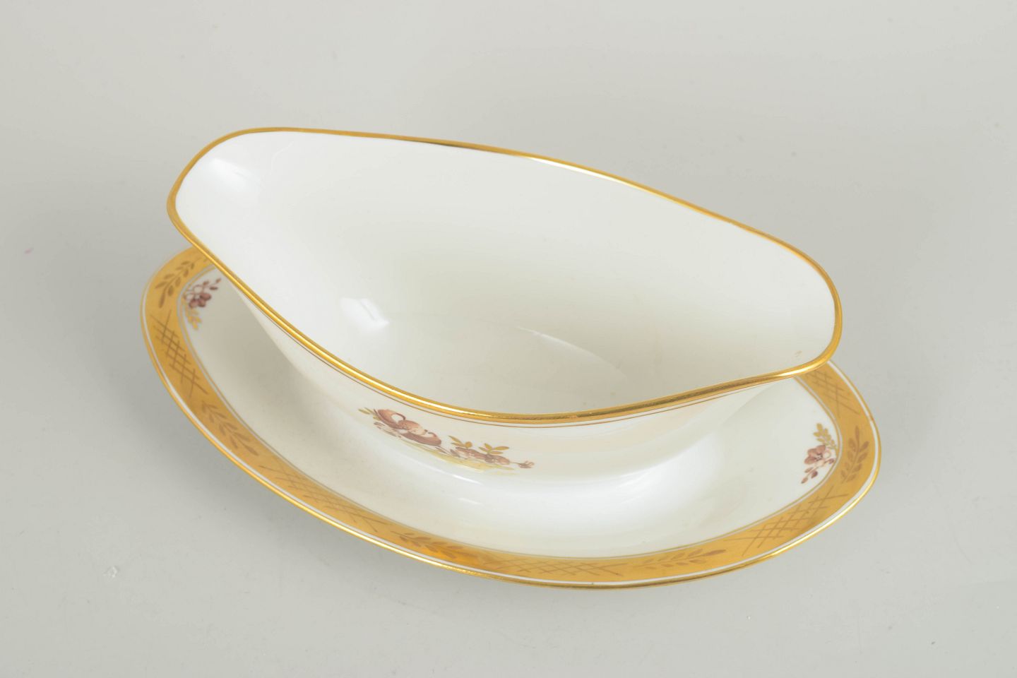 Elegant porcelain sauce boat from Royal Copenhagen’s “Golden Basket” series, model 595/9344. Features an attached underplate, gilded rim and the classic hand-painted floral basket motif.