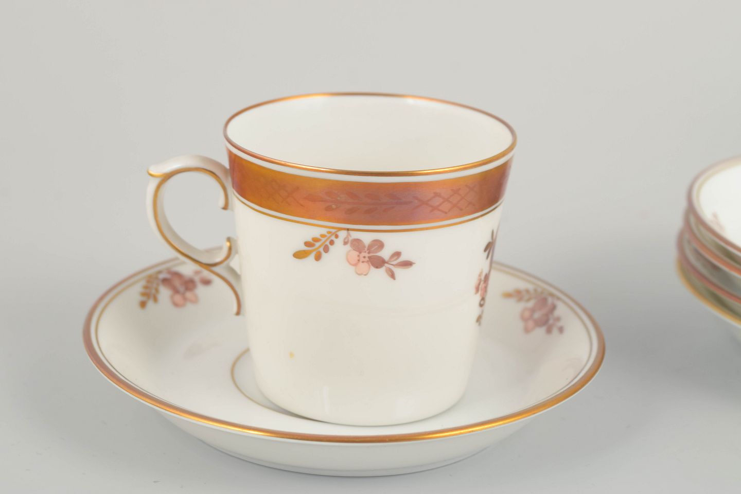 Smukt sæt bestående af fem mokkakopper med tilhørende underkopper fra Royal Copenhagens “Guldkurv”-serie, model 595/9093. Elegant udført i porcelæn med forgyldte kanter og håndmalede blomsterdekorationer.