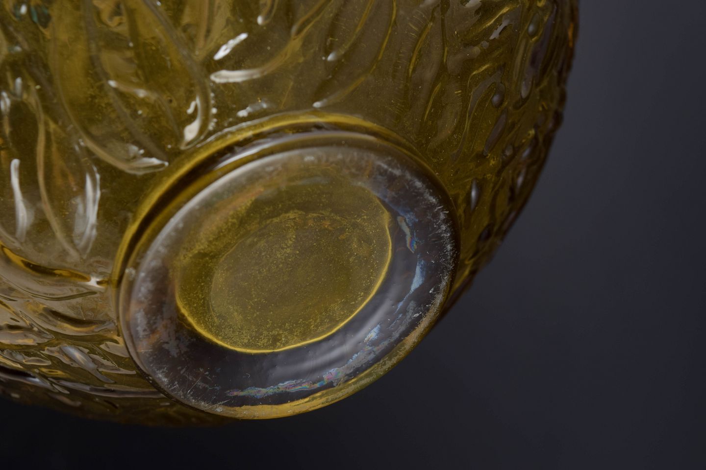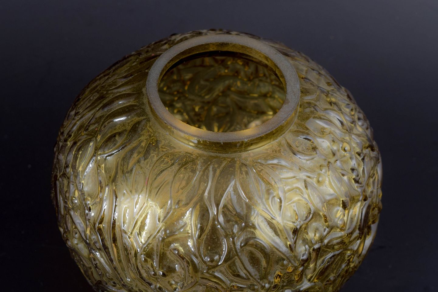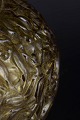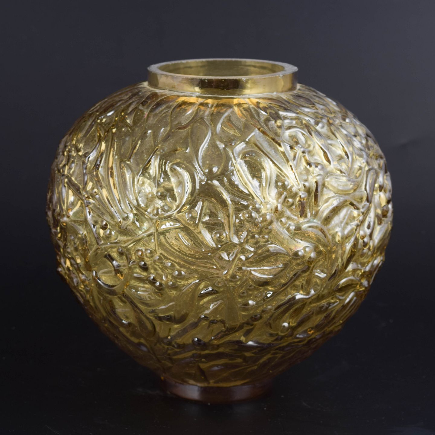 Dekorativ, mundblæst vase i ravfarvet glas med dybt reliefdekoreret overflade af blade og bær. Den organiske ornamentik og varme farvetone giver et udtryk, der er karakteristisk for fransk art glass i midten af det 20. århundrede.