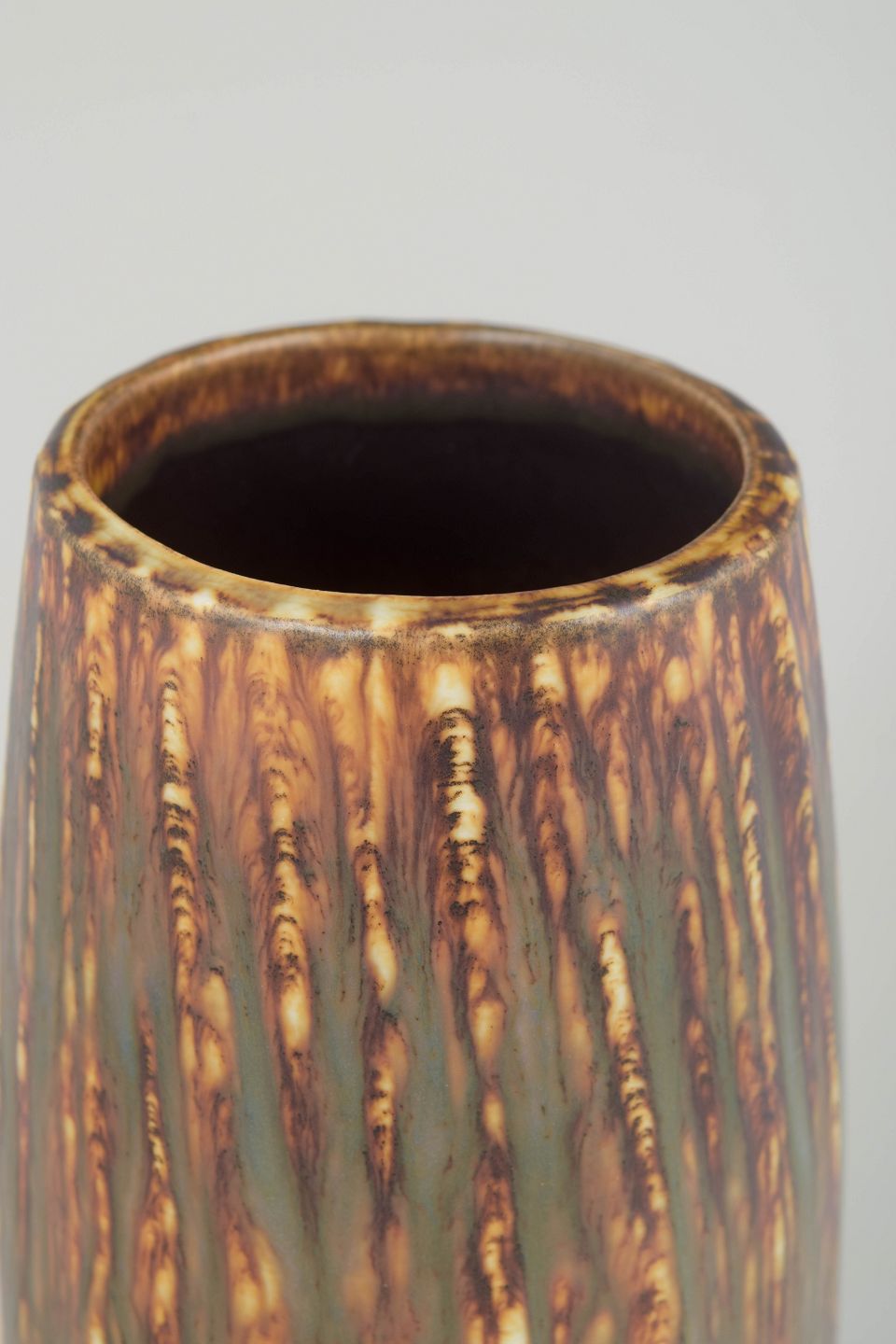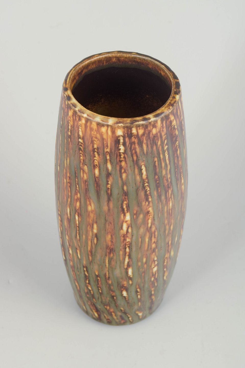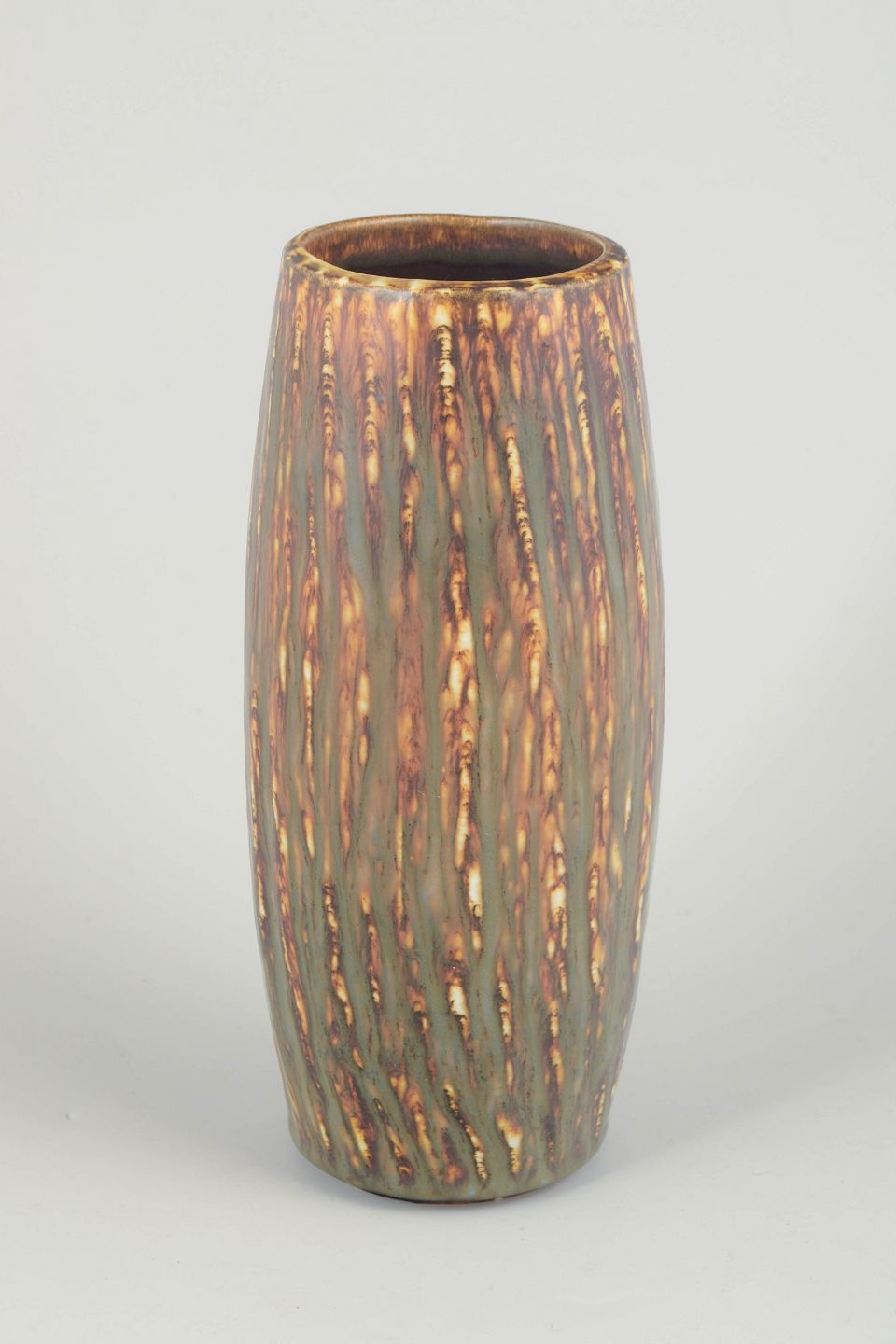 Elegant, høj cylindrisk vase i stentøj med den karakteristiske birketræs glasur, kendetegnet ved lodrette, levende striber i varme brunlige, grønne og gyldne nuancer. Glasuren giver en tydelig association til bark og naturmaterialer og er et klassisk eksempel på Gunnar Nylunds organiske og naturinspirerede formsprog hos Rörstrand.