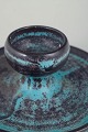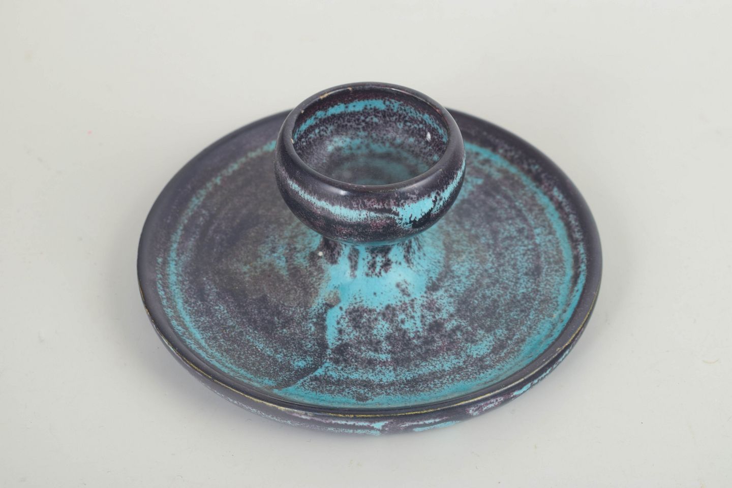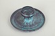 Lav, rund lysestage i stentøj med centralt placeret lysholder og bred, balanceret fod. Udført i karakteristisk grøn og sort dobbeltglasur med levende, let metallisk spil, der løber over overfladen og fremhæver formens ro og tyngde. Et klassisk eksempel på Svend Hammershøis funktionelle og arkitektoniske formsprog fra mellemkrigstiden.