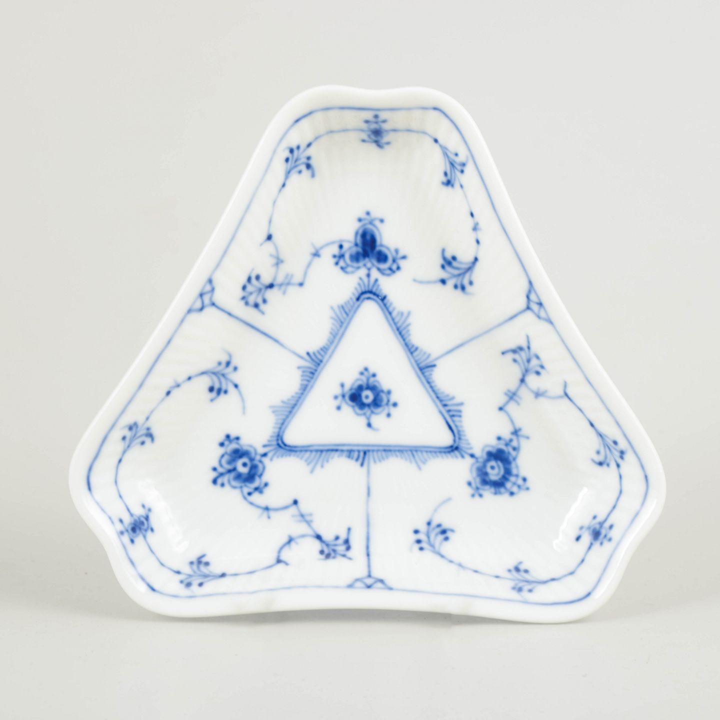 Dekorativ trekantet asiet i Musselmalet Riflet, udført i riflet form med blødt afrundede hjørner og dekoreret med håndmalet koboltblå underglasur. Asietten har et centralt trekantet spejl omgivet af den klassiske musselmalede dekoration og fremstår som en elegant og relativt sjældent forekommende mindre serveringsdel.