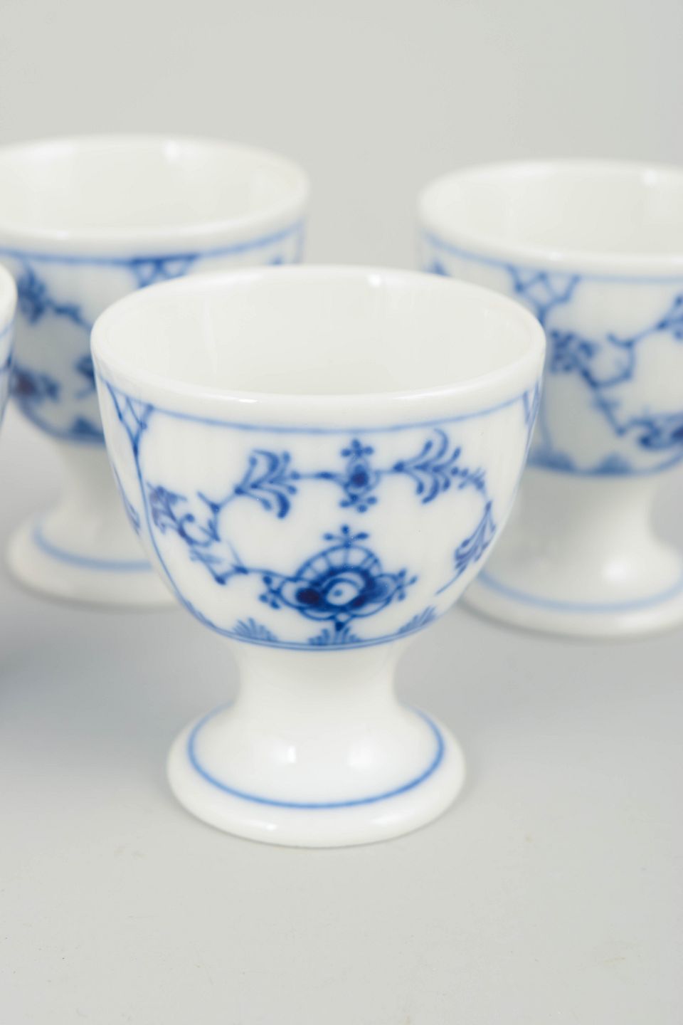 Sæt bestående af fire klassiske æggebægre i Musselmalet Riflet, udført i riflet form med fod og dekoreret med håndmalet koboltblå underglasur. Æggebægrene har en elegant og tidstypisk proportionering og repræsenterer tidlig 1900-tals bordkultur.