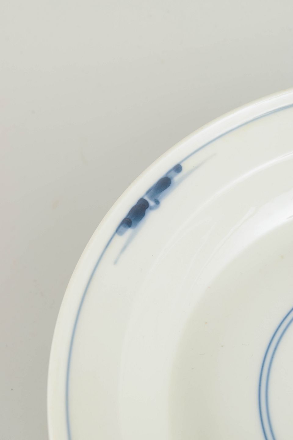 Sæt bestående af tre dybe tallerkener i Gemina-stellet, udført i hvidt porcelæn med diskret, grafisk dekoration i blå underglasur. En stram og moderne formgivning, der er karakteristisk for Royal Copenhagens produktion i 1960’erne.