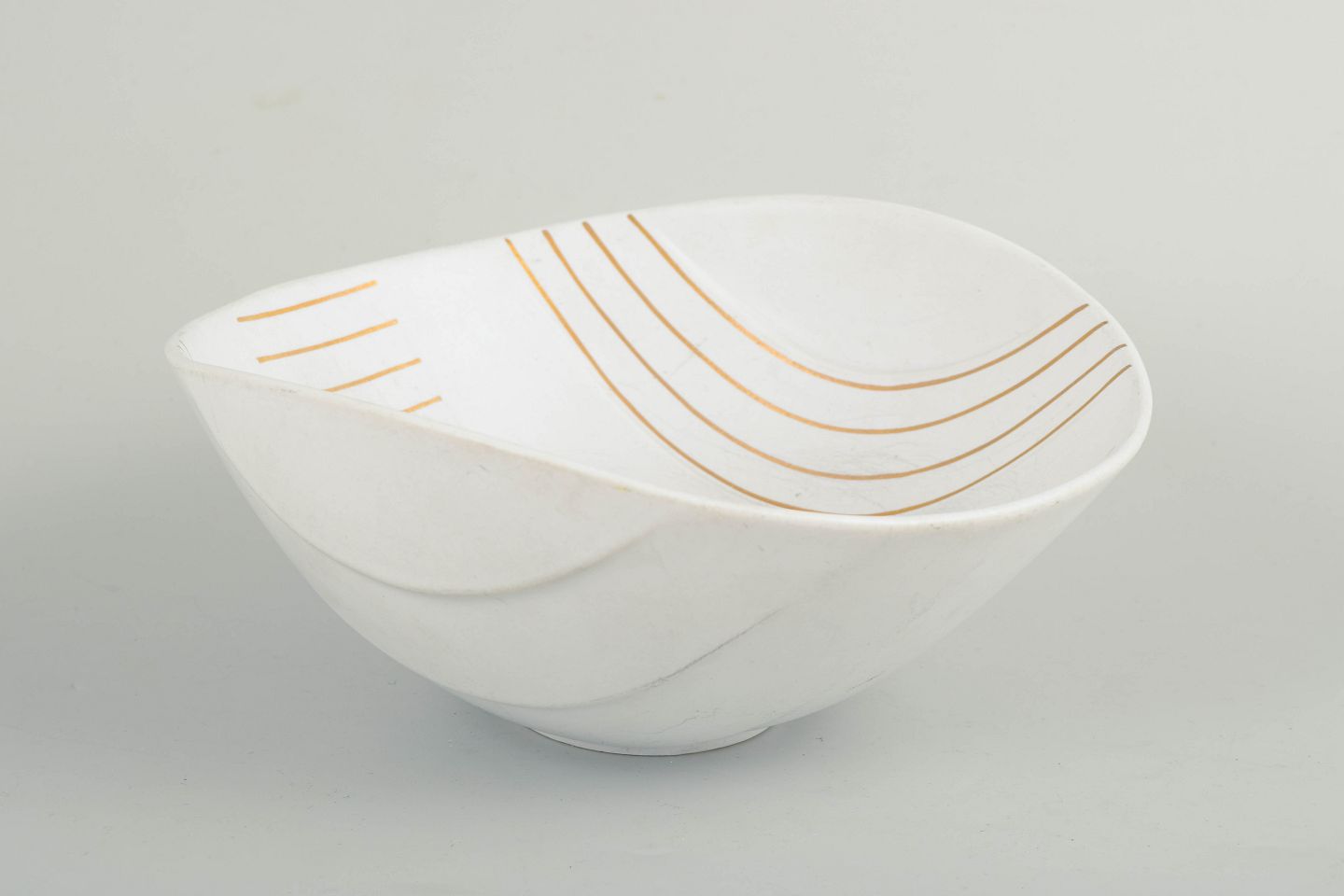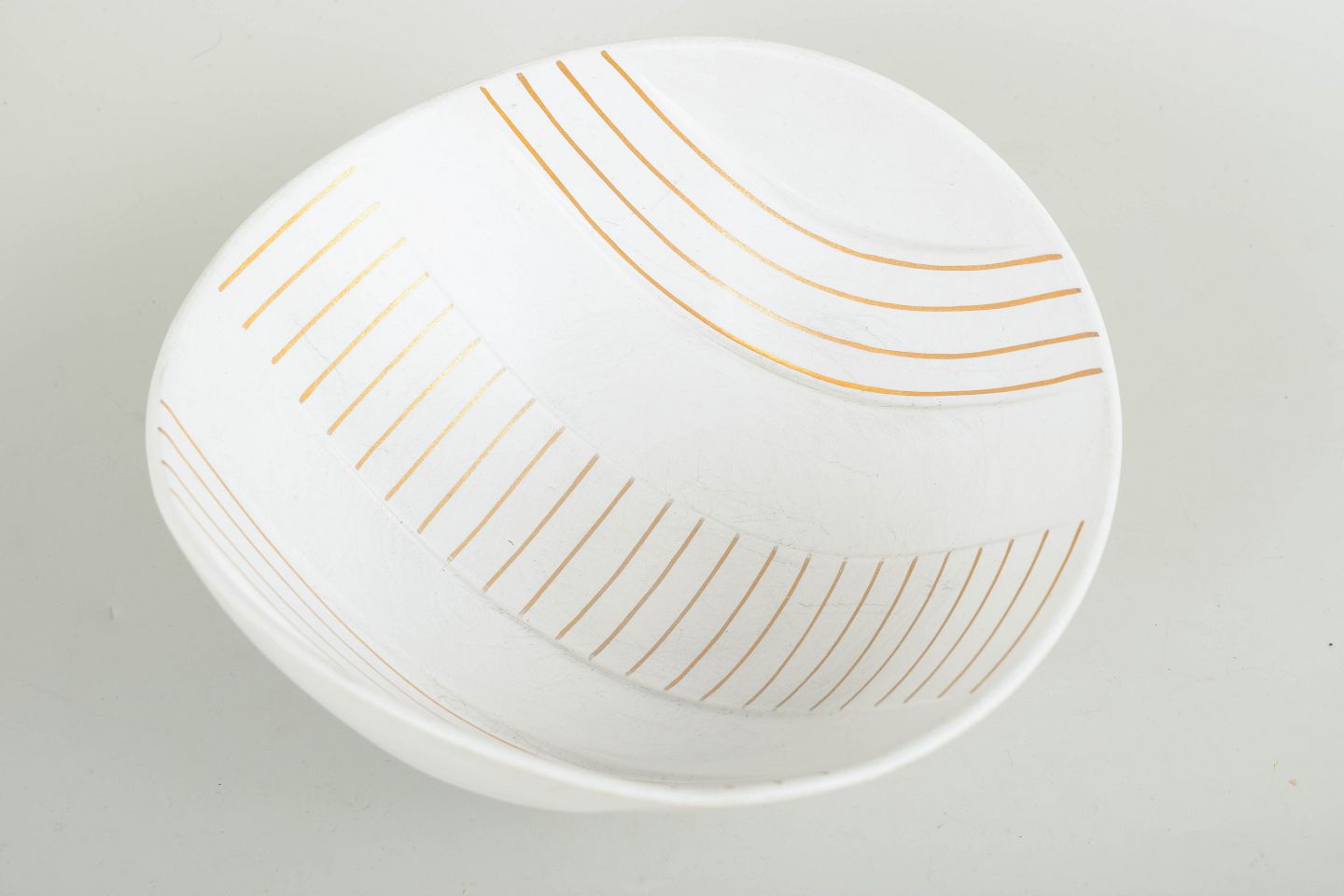 Stor, organisk formet skål i glaseret keramik med svagt bølgende relief og fin gulddekoration. Udført i studiohand, “Guldsurrea”.