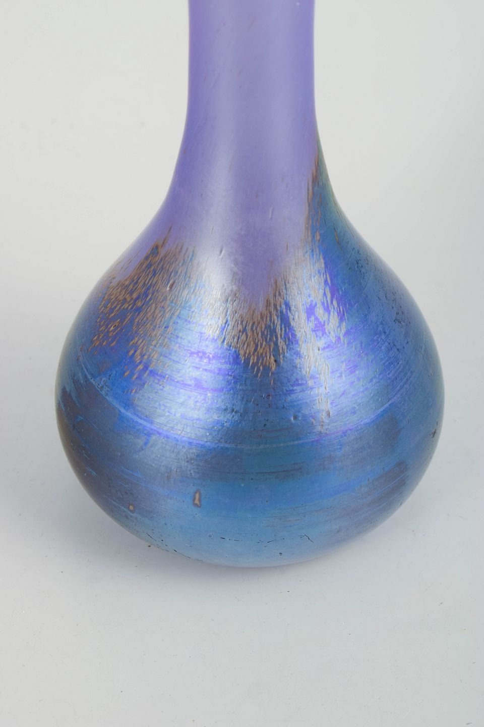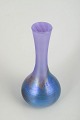 Slender Art Nouveau art-glass vase with a violet neck and blue-green body. The elongated form with narrow opening and rounded base is enhanced by a refined iridescent surface that creates a lively colour play depending on the light. The softly satin-like finish and subtle tonal transitions are characteristic of Lötz production around 1900.