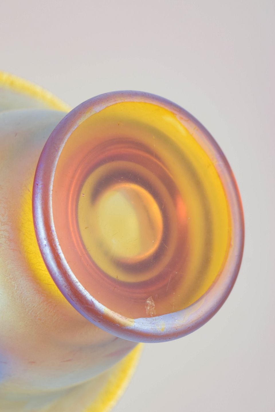 Elegant vase in iridescent art glass, model Myra, with a softly flared rim and raised foot; the pearlescent surface displays a refined play of warm colours typical of period luxury glass.