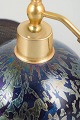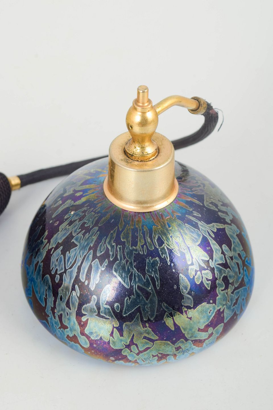 Art Nouveau perfume diffuser in iridescent art glass with blue-violet and green tones and organic, flowing vein-like decoration. Domed body fitted with metal mounts and a black rubber bulb with tassel. Executed as a table perfume diffuser, combining decorative glasswork with functional design.
