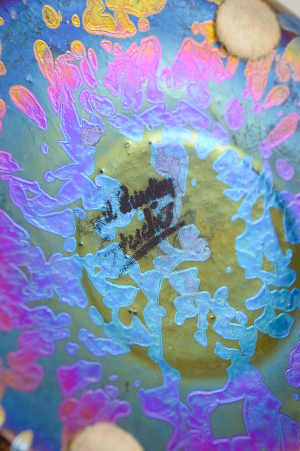 Material: Iridescent art glass, metal, rubber.
