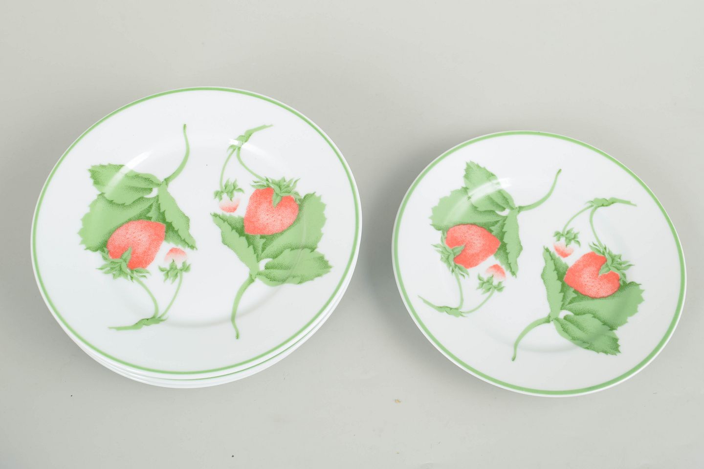 Sæt med fem mindre tallerkener i porcelæn med dekoration af jordbær og blade i serien Fraise.
