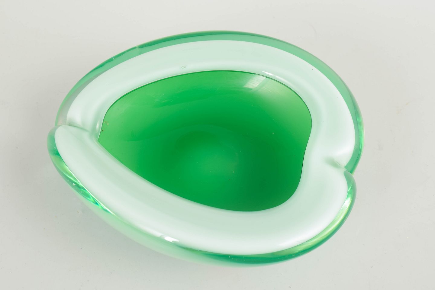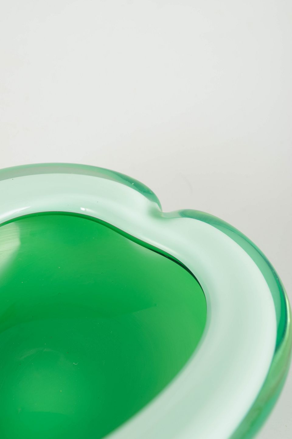 Low bowl in hand-blown opaline and green glass with an organic, asymmetrical form and polished surface; retaining original Vetro Artistico Murano label.