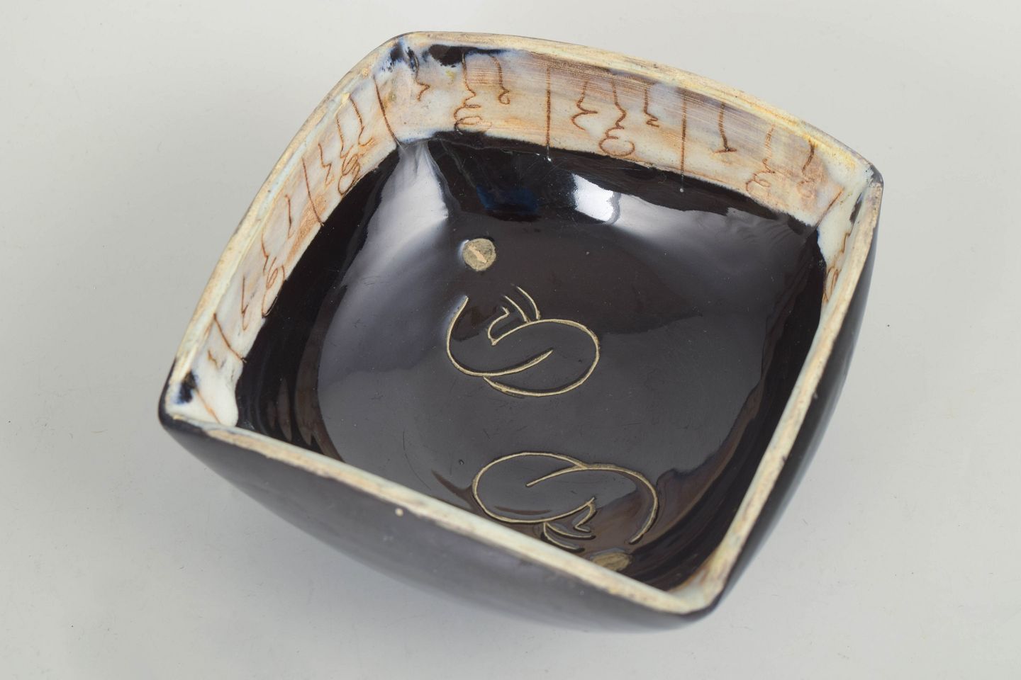 Organically shaped ceramic bowl with an asymmetrical, slightly faceted rim. Dark glossy glaze to the exterior and a light interior with brown drip effects and a fine crackled appearance.