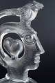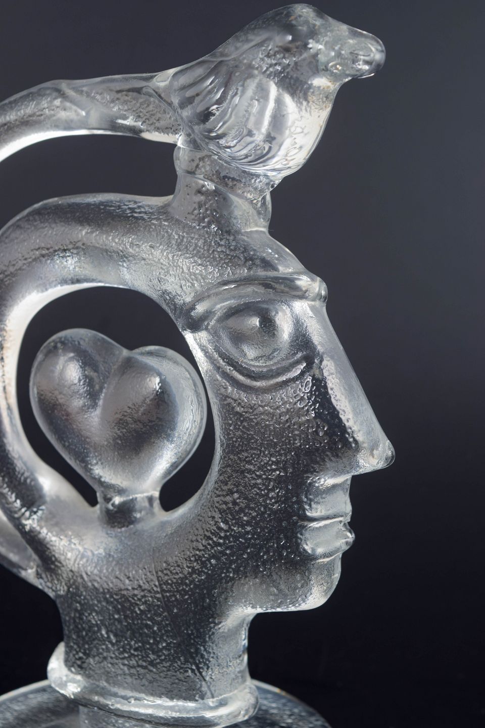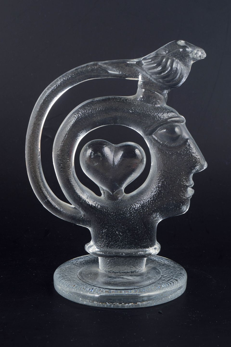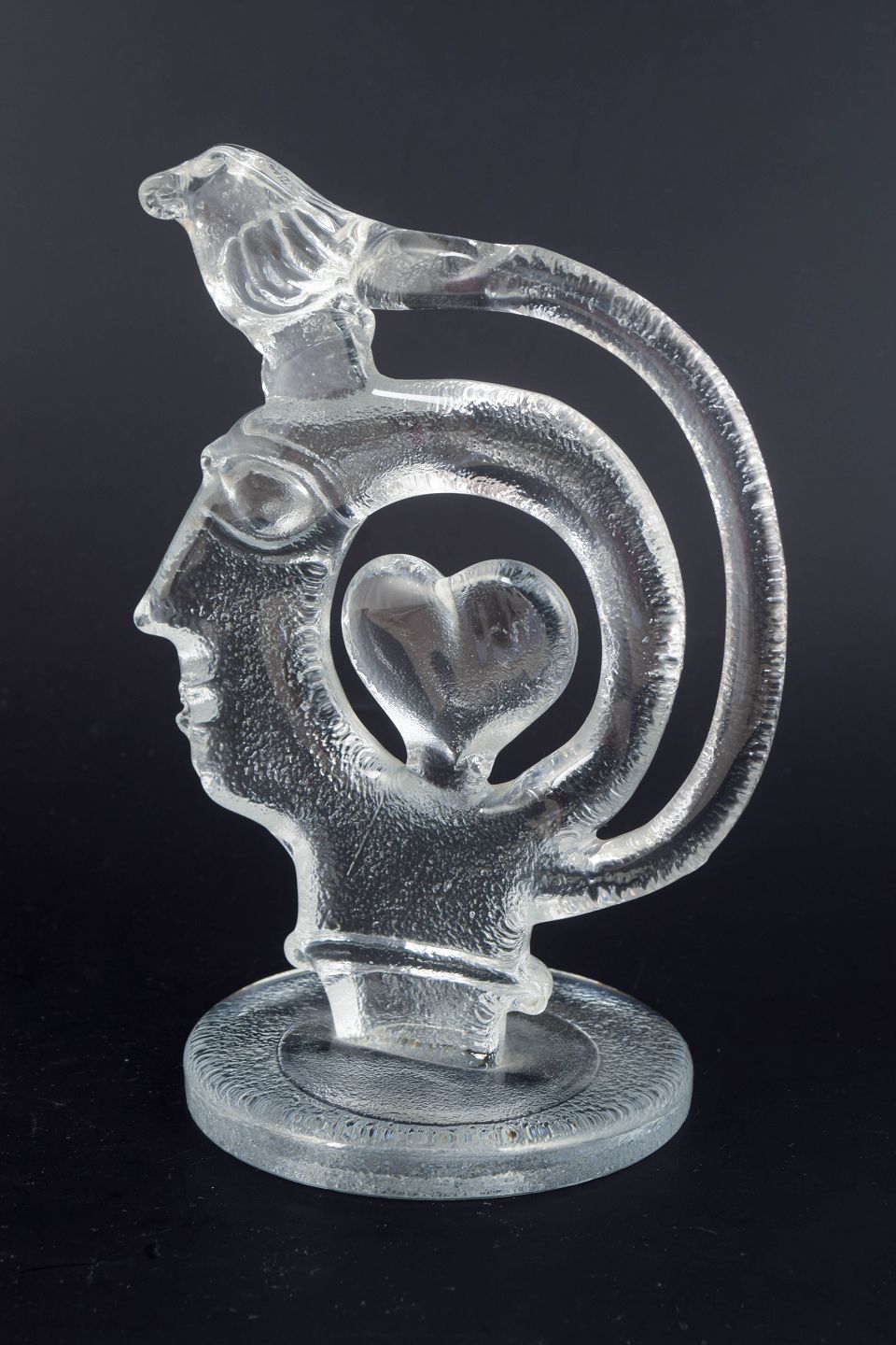Skulpturel form i klart, massivt glas med stiliseret menneskehoved i profil, integreret hjerteform i midten samt fuglefigur placeret øverst i den buede struktur. Overfladen har let matterede partier og indre luftbobler, som skaber dybde og optisk spil i glasset. Usigneret.