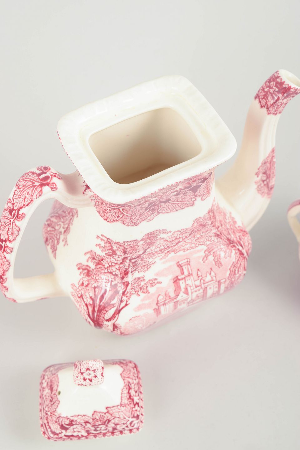 Kaffekande og sukkerskål i fajance fra Mason’s og Palissy, dekoreret i rød transferware med landskabs- og arkitekturmotiver.