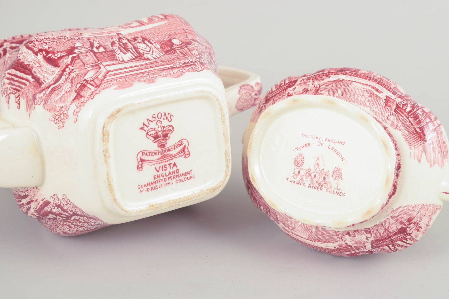 Mason’s udspringer af pottemageren Charles James Mason (1791–1856), som grundlagde virksomheden i Staffordshire i begyndelsen af 1800-tallet og blev kendt for sin ironstone-produktion samt senere fajance med transferware-dekoration. Palissy var aktiv i første halvdel af 1900-tallet og producerede dekorative fajancegenstande med motiver inspireret af engelske landskaber og historiske scener. Begge repræsenterer den stærke engelske fajancetradition med rød transferware, som var udbredt i mellemkrigstiden.