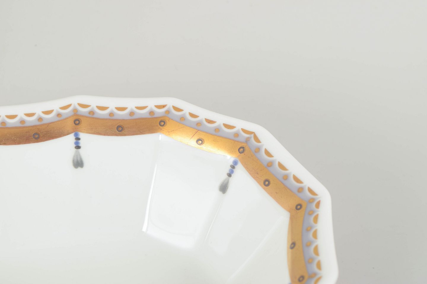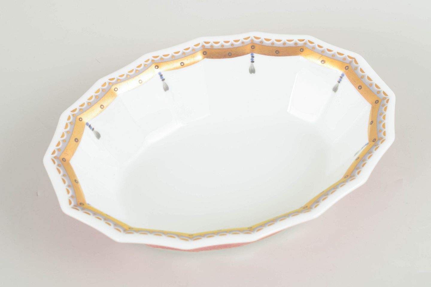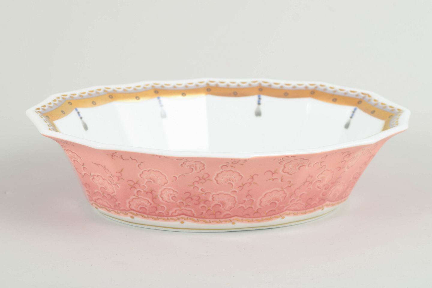Lav, bred skål i hvidt porcelæn dekoreret med Fairytale-mønstre i bløde rosa og gyldne toner med fine ornamentale detaljer. Modellen er produceret i perioden 1992–1999 og er udført i 1. sortering. Model 579.