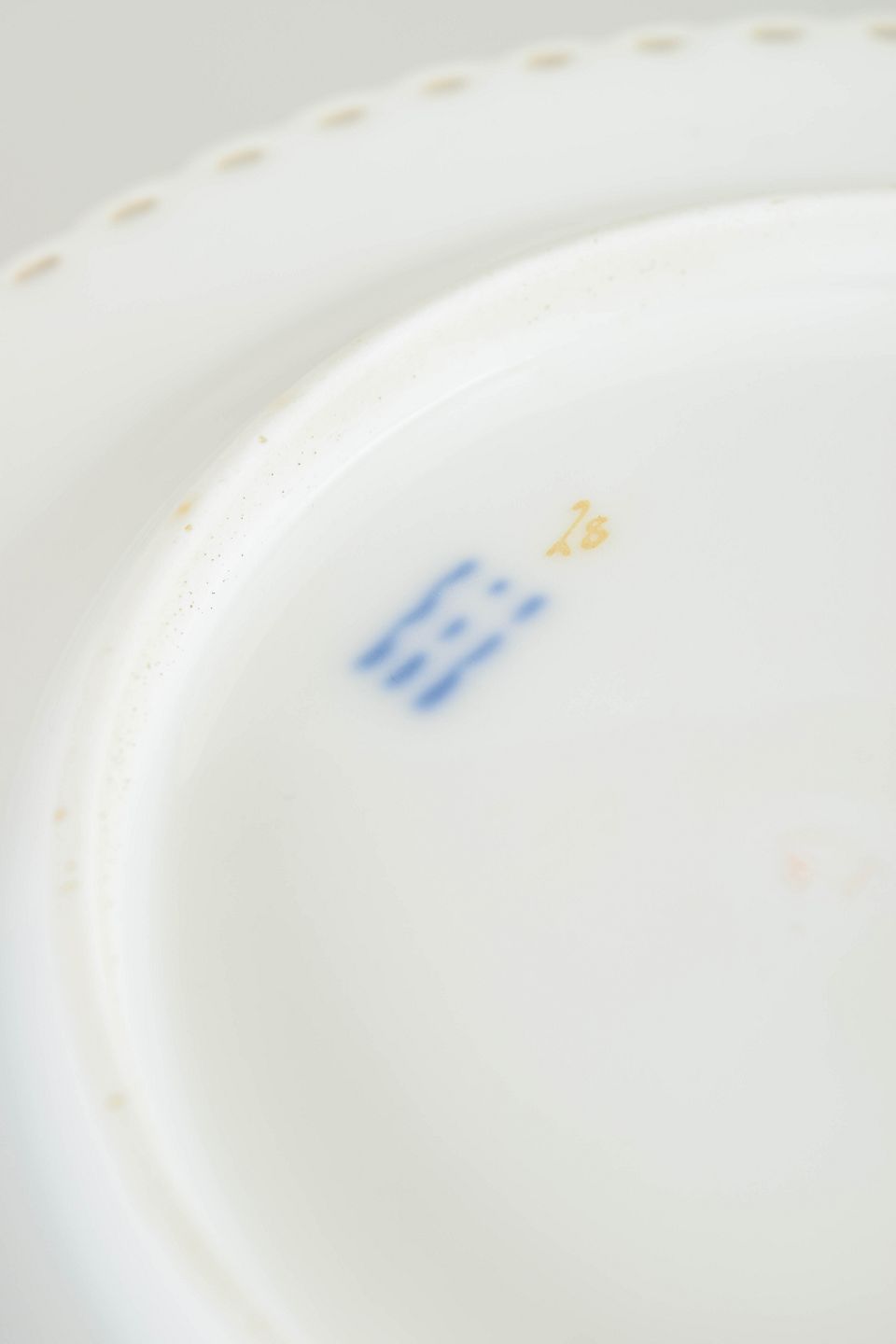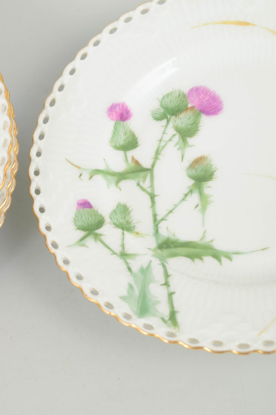 Håndmalede porcelænstallerkener med gennembrudt rand og naturalistisk dekoration med tidselmotiv. Udført med fine farvenuancer og diskrete forgyldninger, karakteristisk for Royal Copenhagens produktion i det 19. århundrede.