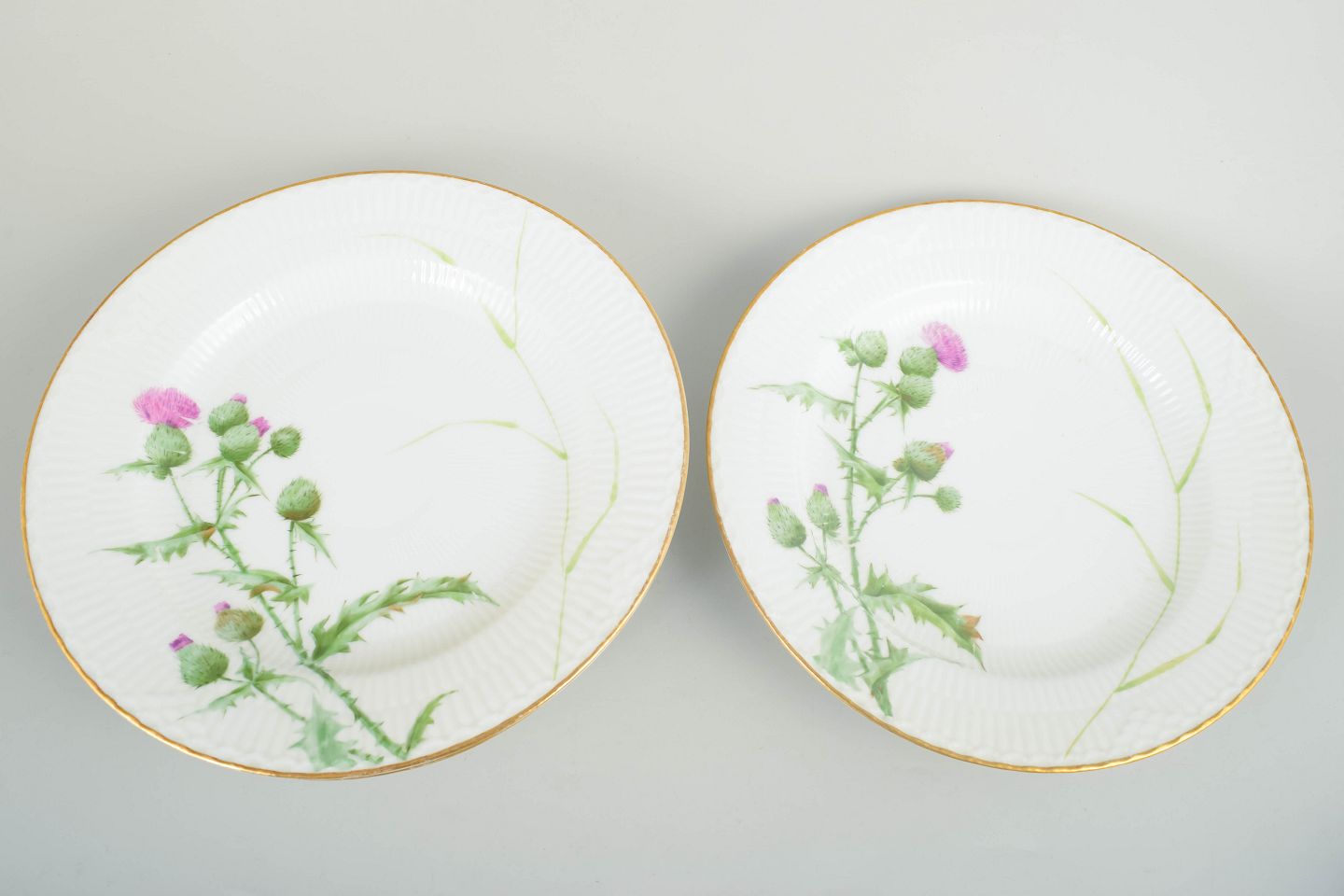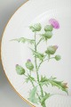 Sæt af fire middagstallerkener i håndmalet porcelæn fra Tidsel serien. Dekoreret med naturalistisk tidselmotiv i grønne og rosa nuancer samt forgyldt kant. Første sortering.