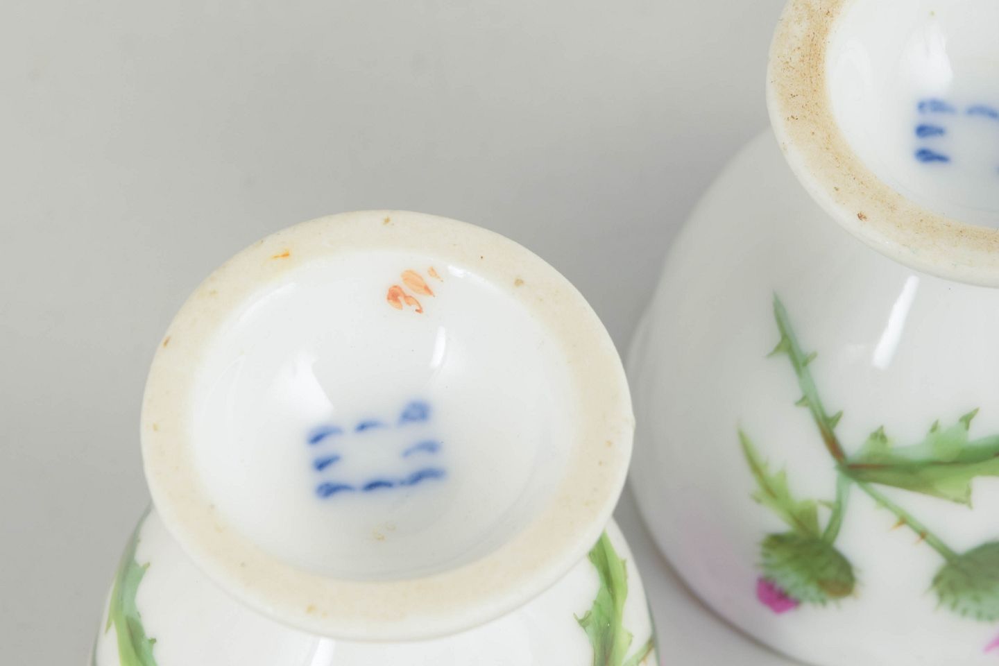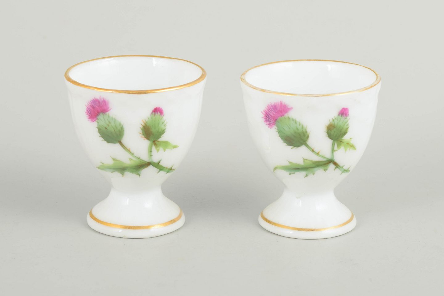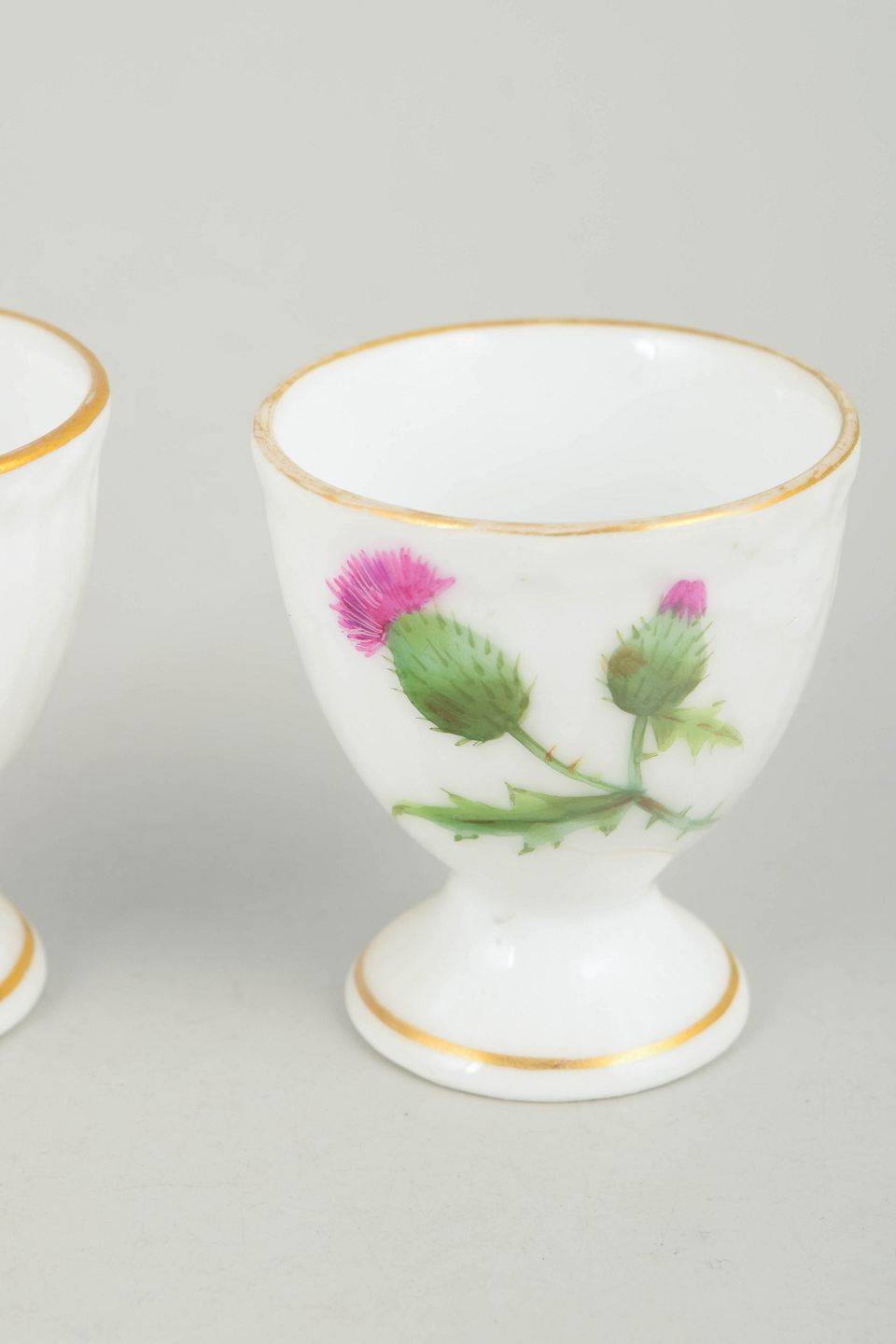 To æggebægre i håndmalet porcelæn med motiv fra Tidsel serien. Dekoreret med tidselblomst i grønne og rosa nuancer samt forgyldt kant. Første sortering.