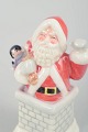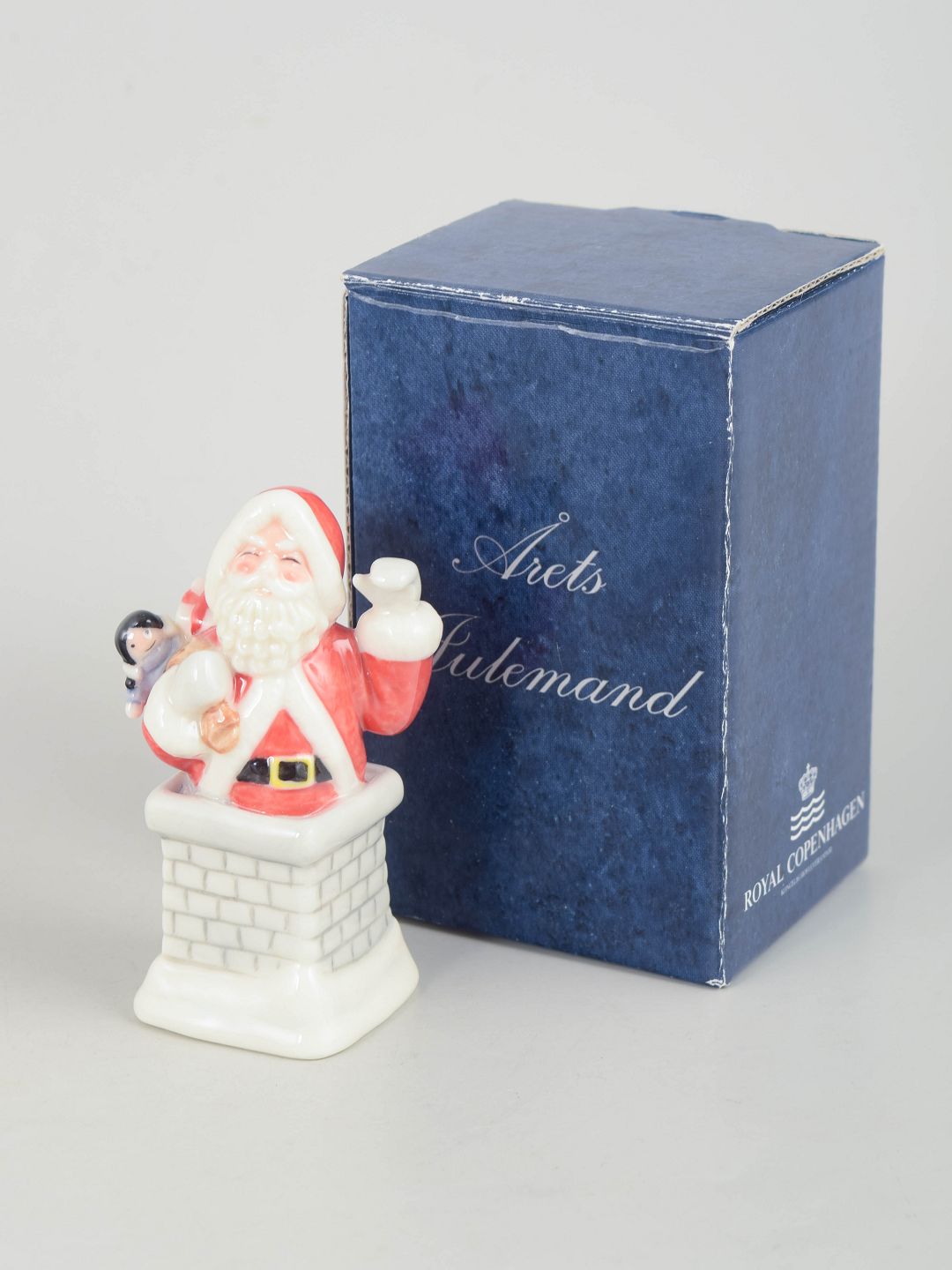 Dekorativ julemand figur i håndmalet porcelæn fra 2004, udført stående i skorsten med lille dukke i hånden. Figuren er detaljeret modelleret med klassisk rød dragt, hvid pelskant og sort bælte. Leveres med original æske. Første sortering.