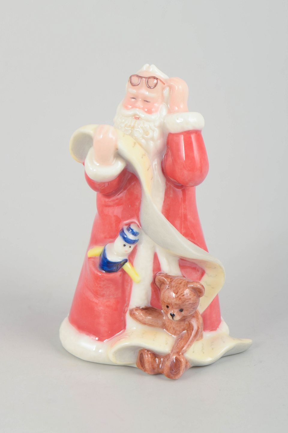 Dekorativ julemand figur i håndmalet porcelæn fra 2003, udført med bamse og legetøj. Figuren er detaljeret modelleret med klassisk rød kappe og hvid pelskant. Leveres med original æske. Første sortering.