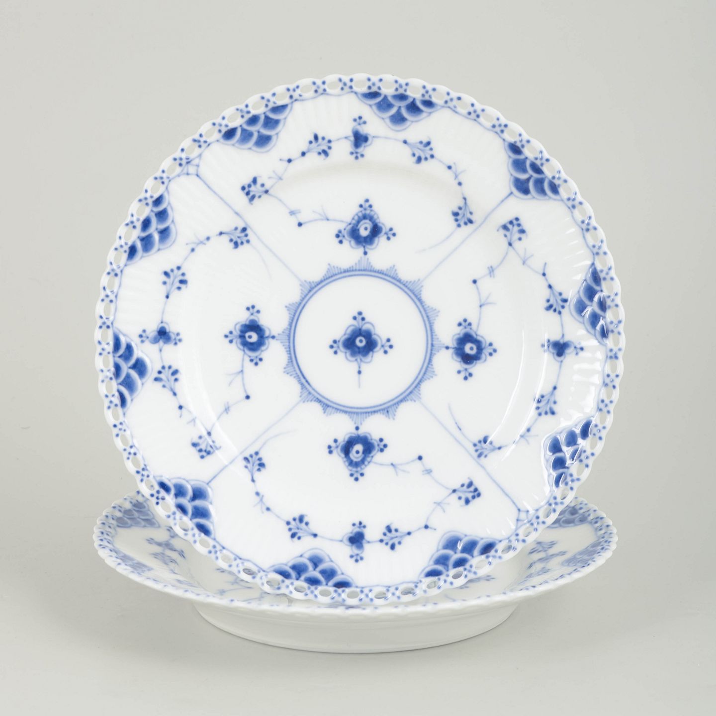 Sæt af to frokosttallerkener i håndmalet porcelæn fra Musselmalet Helblonde med klassisk underglasurdekoration i koboltblå og gennembrudt blondekant. Model 1/1086. Første sortering. Den ene fremstillet i 1920’erne, den anden i 1890’erne.