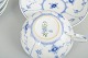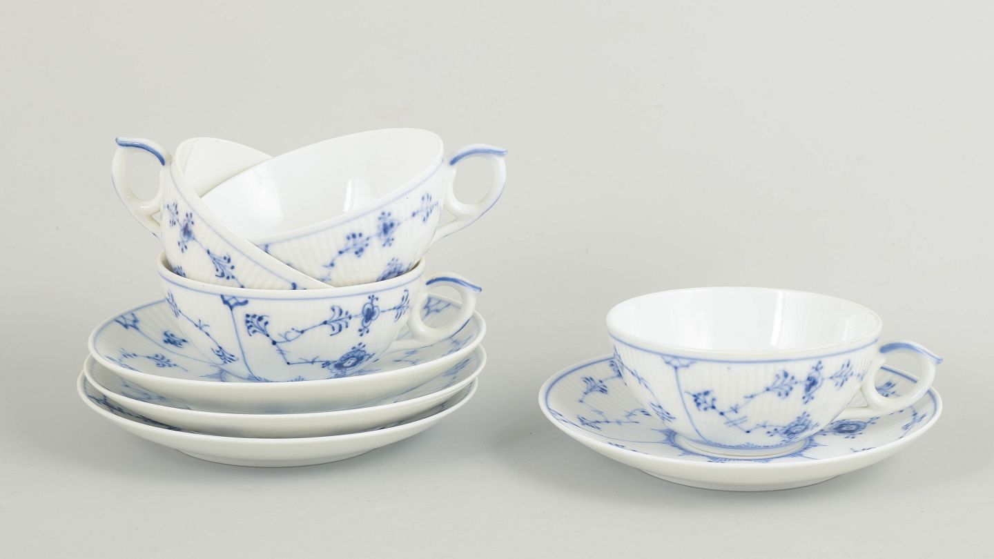 Royal Copenhagen Musselmalet Riflet, sæt af fire tekopper med tilhørende underkopper.