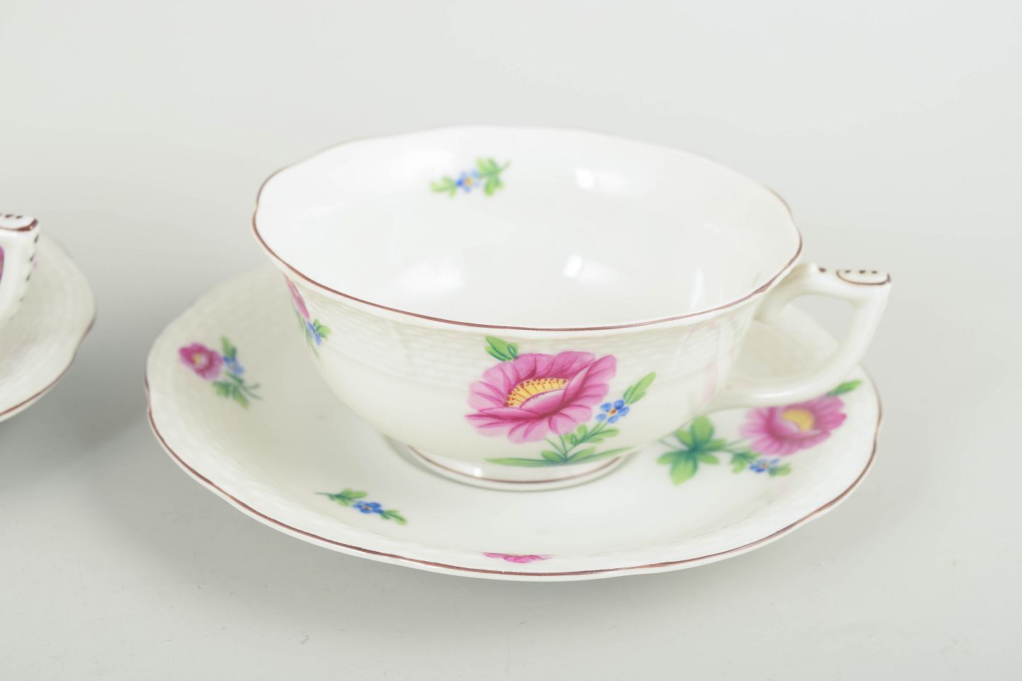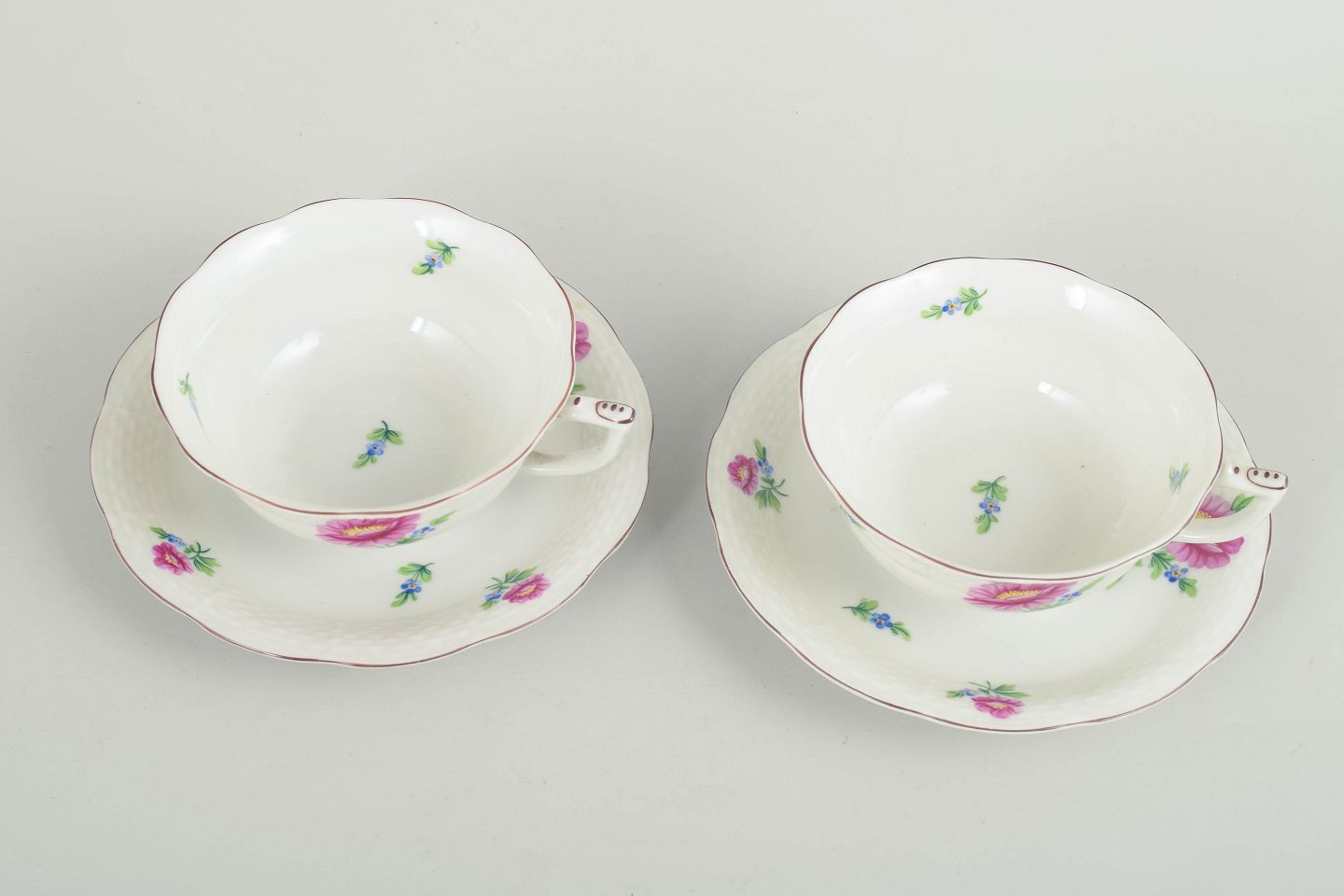 Sæt bestående af to håndmalede tekopper med matchende underkopper i porcelæn fra Herend. Dekoreret med naturalistiske blomster i rosa og blå nuancer samt fine grønne blade. Fabriksmærket i blåt under bunden.