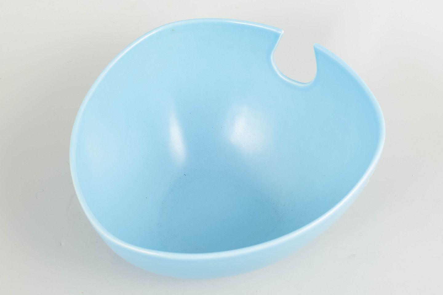 Stor salatskål i stentøj med lyseblå glasur og karakteristisk tud i kanten. Stemplet Höganäs Keramik Made in Sweden.