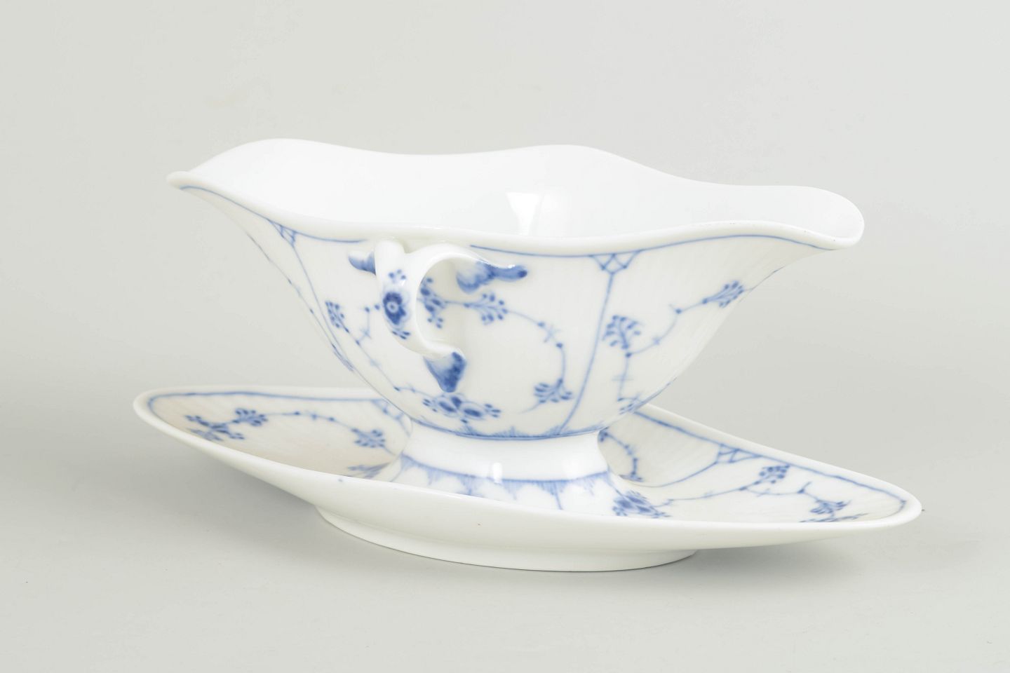 Sauceskål med fast underfad i håndmalet porcelæn fra Musselmalet Riflet med klassisk underglasurdekoration i koboltblå og riflede felter. Model 1/202. H. 10 cm, D. 24 cm. Annulleret med to indridsede streger under bunden. Fremstillet i 1920’erne.