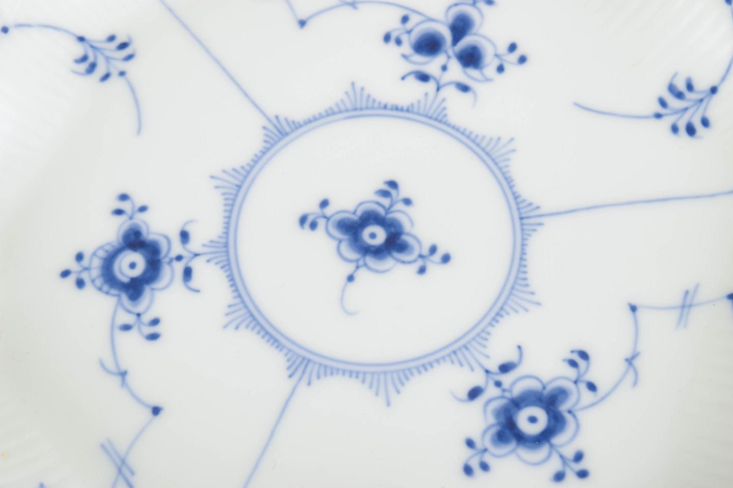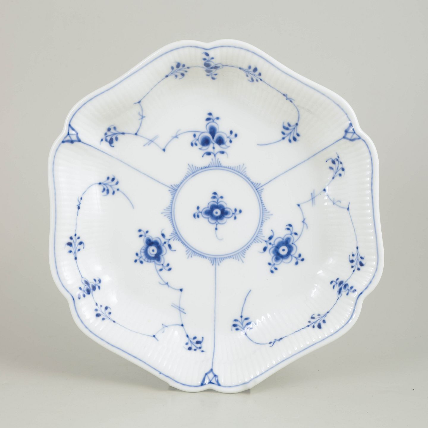 Rare dish in hand-painted porcelain from the Blue Fluted Plain service with classic underglaze cobalt blue decoration and fluted surfaces. Model 1/2195. H. 4 cm, D. 23 cm. Cancelled with one incised line on the base. Produced in the 1920s.