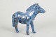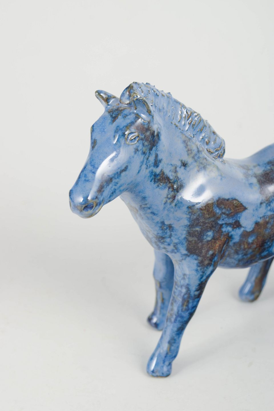 Unik keramisk figur forestillende et føl udført i stentøj med blank glasur i blå toner med brunlige nuancer. Figuren er modelleret med en naturlig kropsholdning og detaljeret manke og hoved, hvilket giver et levende og karakterfuldt udtryk. Usigneret unika fra 1970’erne.