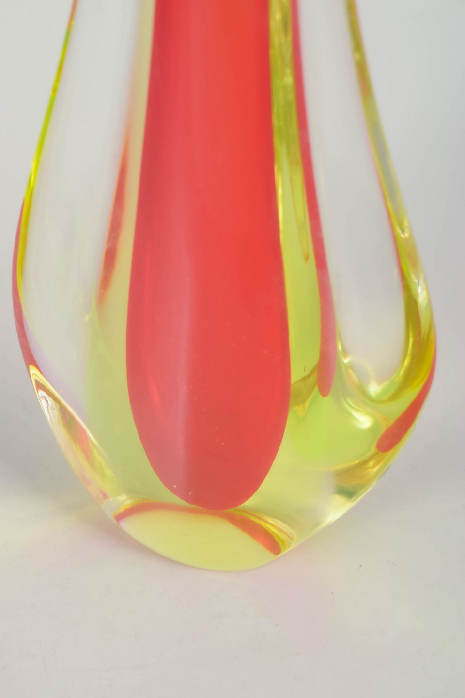 Elegant kunstglasvase i klart glas med indkapslet rød kerne og blød dråbeformet silhuet, udført i karakteristisk Murano-stil med lang slank hals.