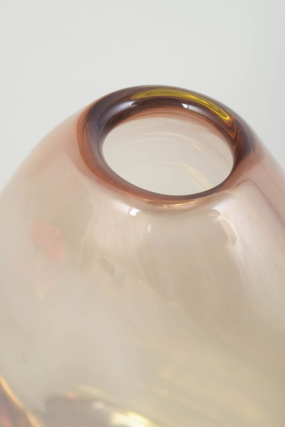 Elegant kunstglasvase i klart glas med varm ravfarvet tone og blød organisk form, udført i karakteristisk Murano-stil med kraftig bund og skulpturel silhuet.