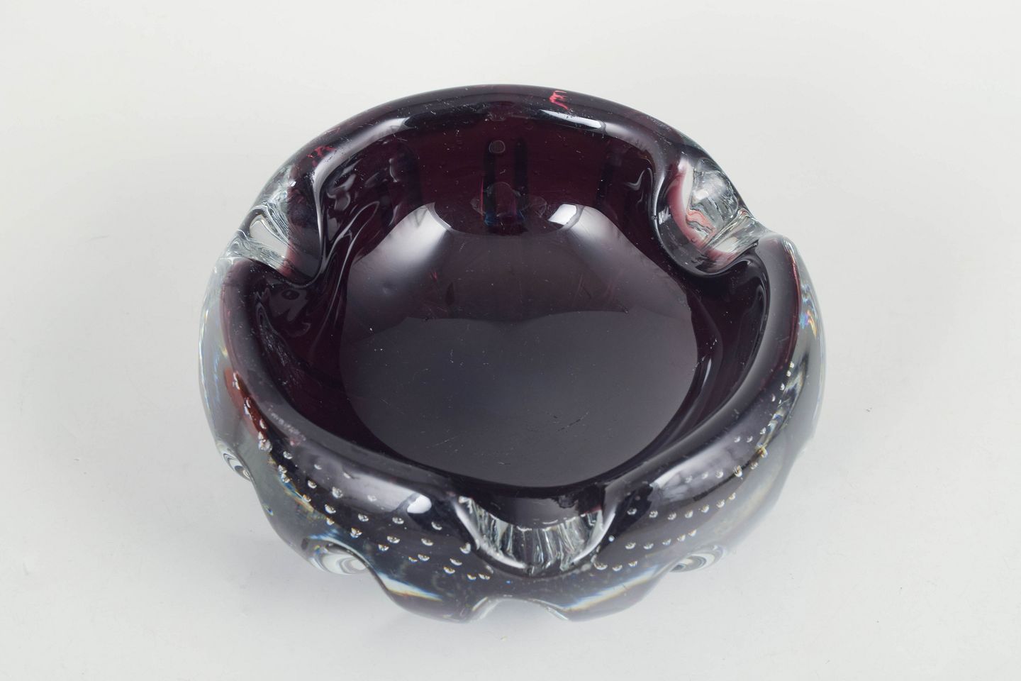 Kraftig kunstglasskål i mørkt glas med indkapslede luftbobler og organisk bølgende rand, udført i karakteristisk Murano-stil med skulpturel form.