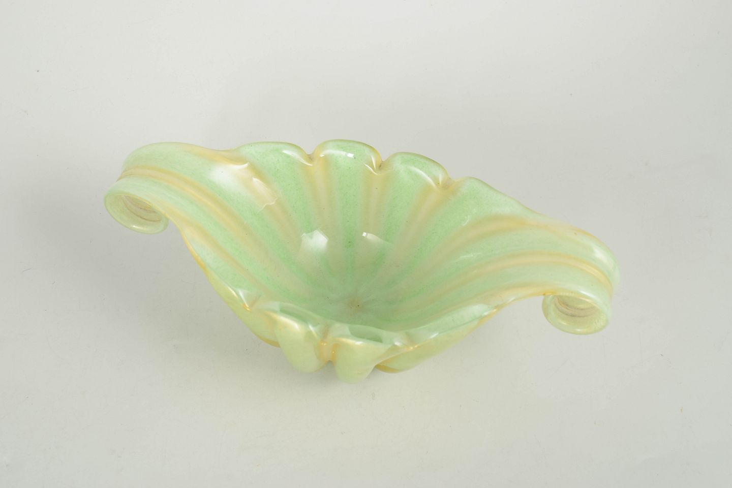 Dekorativ kunstglasskål i iriserende glas med bølgende korpus og elegante opadbøjede ender, udført i karakteristisk Murano-stil med bløde former og lysreflekterende overflade.