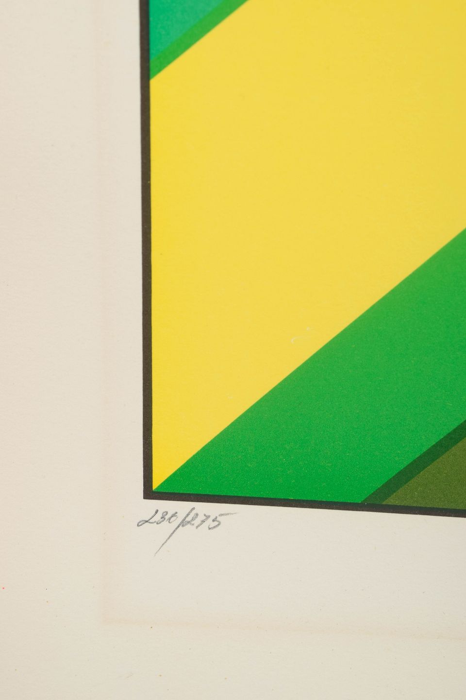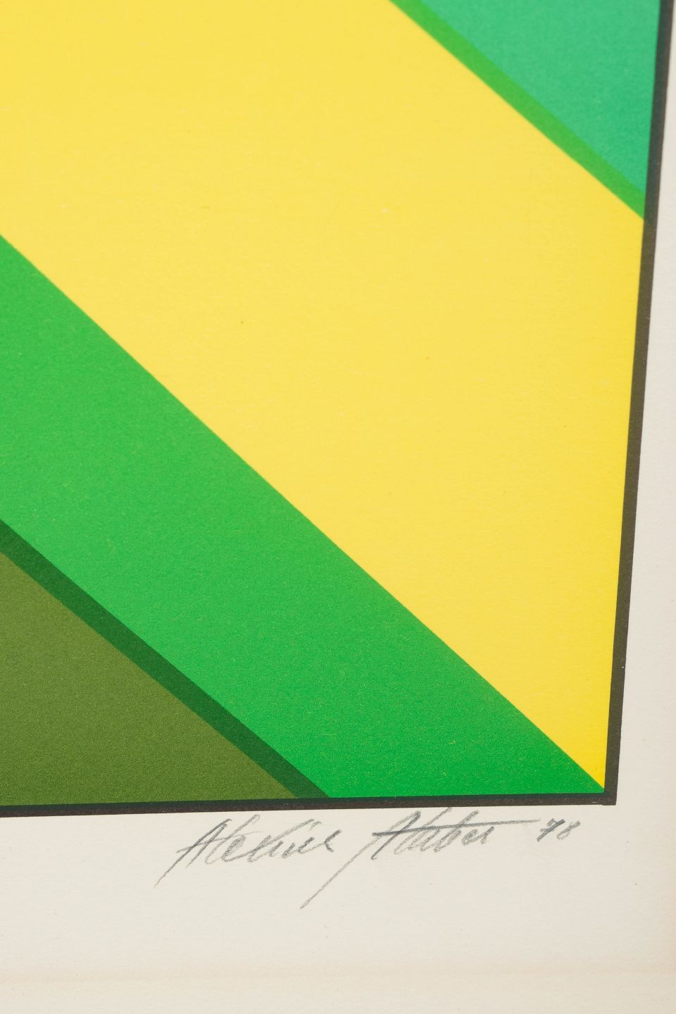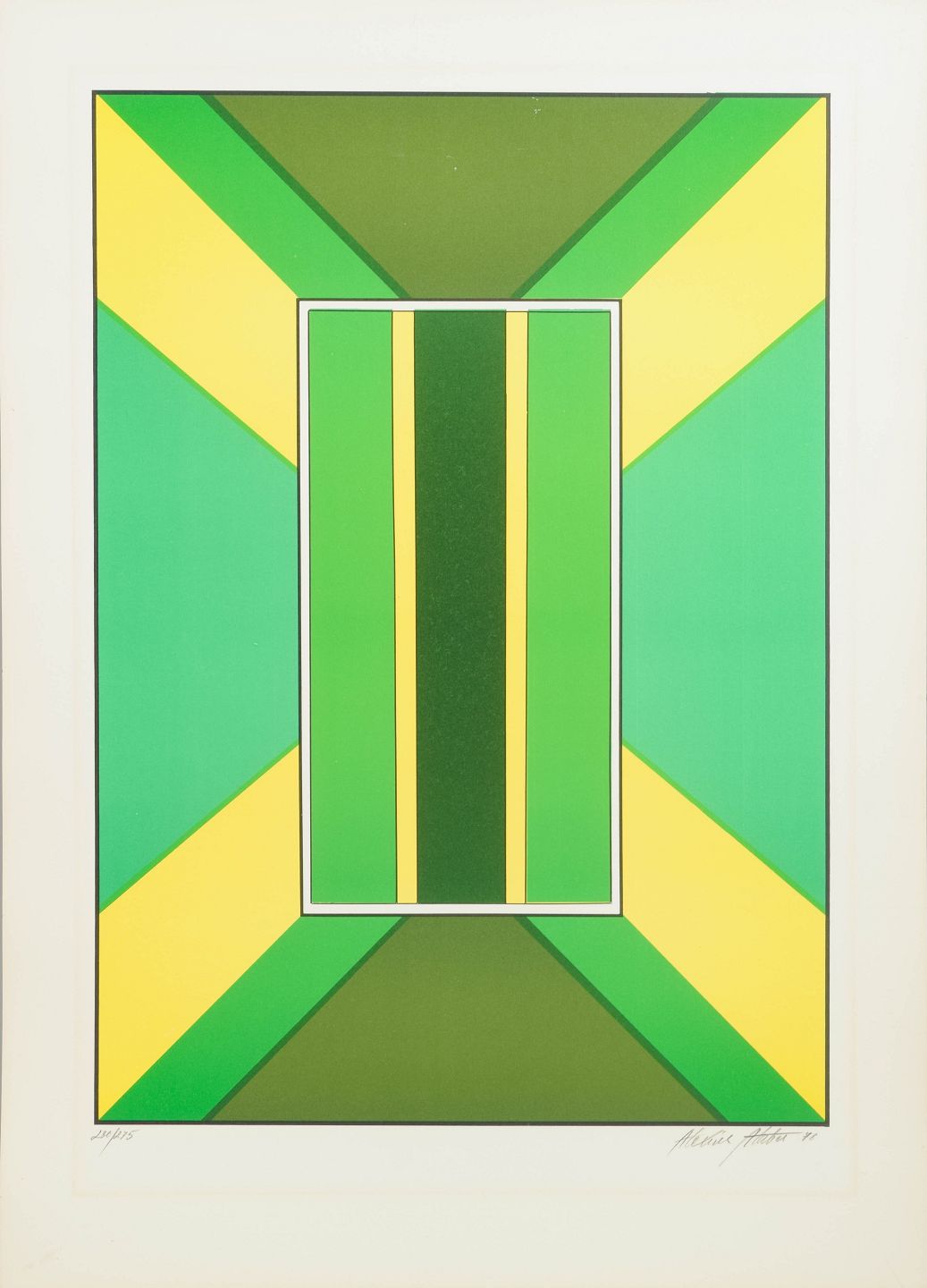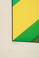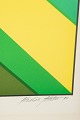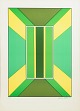 Geometrisk og optisk komposition udført som farvelitografi i klare grønne og gule felter med centralt rektangulært motiv.