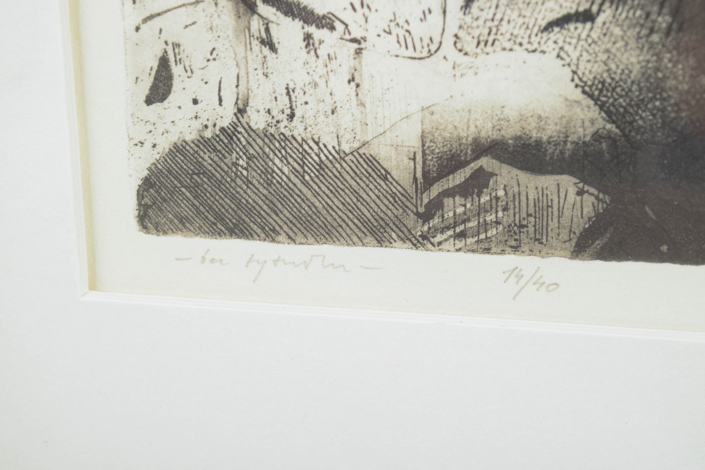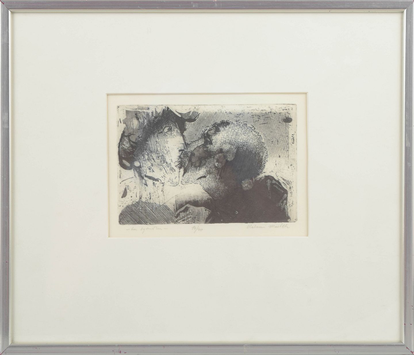 Ekspressivt figurativt motiv udført som litografi med to figurer i tæt komposition, udført i sort og gråtoner med markante grafiske skraveringer. Signeret i blyant nederst, signaturen er vanskelig at tyde, og nummereret 14/40.