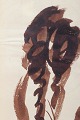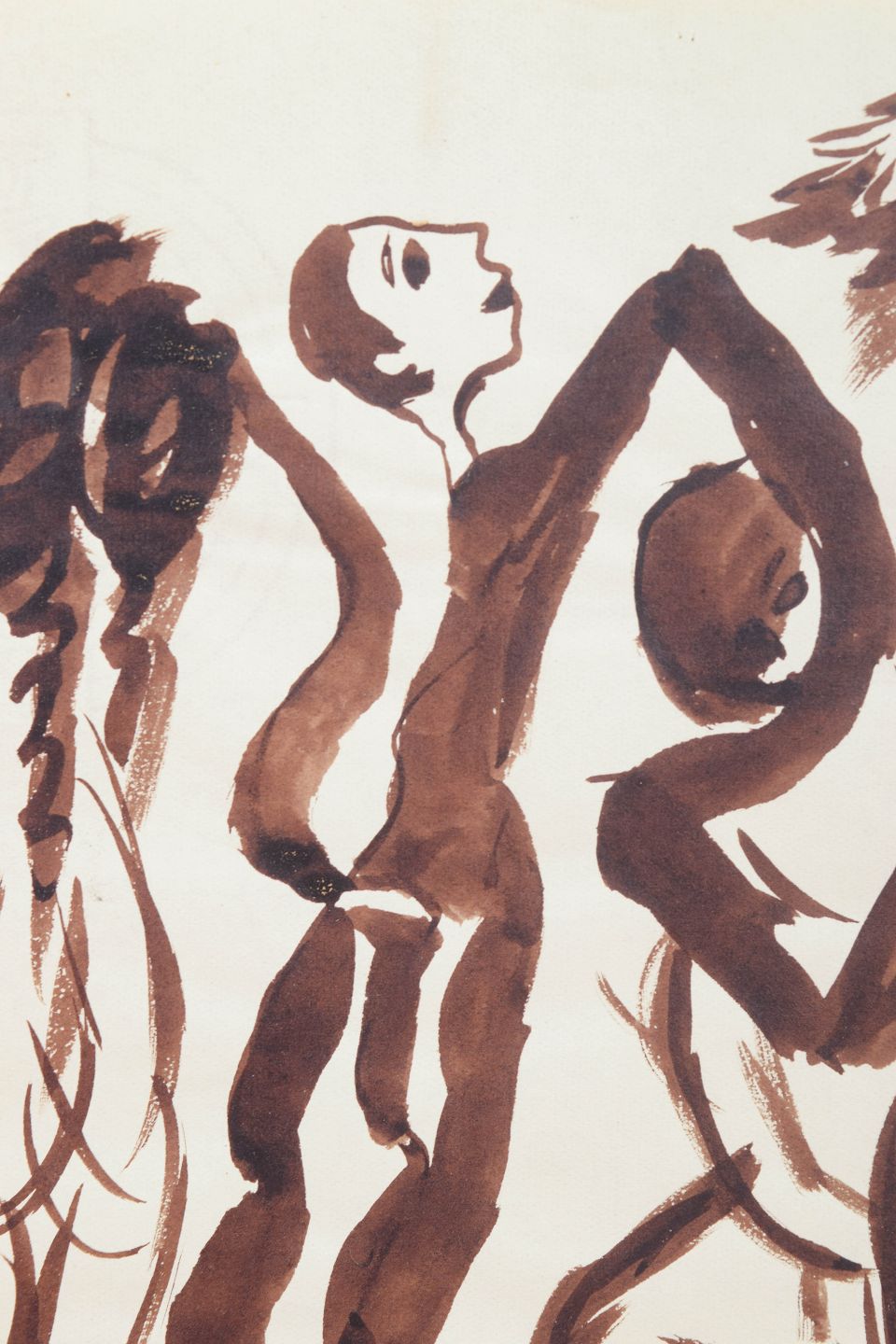 Art deco figurtegning udført på papir med fri og ekspressiv penselstreg i brun tone. Kompositionen viser flere stiliserede menneskefigurer i bevægelse, gengivet med en dynamisk og rytmisk linjeføring karakteristisk for 1930’ernes avantgardistiske tegnekunst. Signeret i blyant nederst.