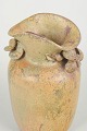 Hånddrejet stentøjsvase med modelnummer 16, udført i organisk form med reliefdekoration af blade ved halsen og dækket af levende glasur i varme jordfarver med nuancerede overgange.