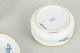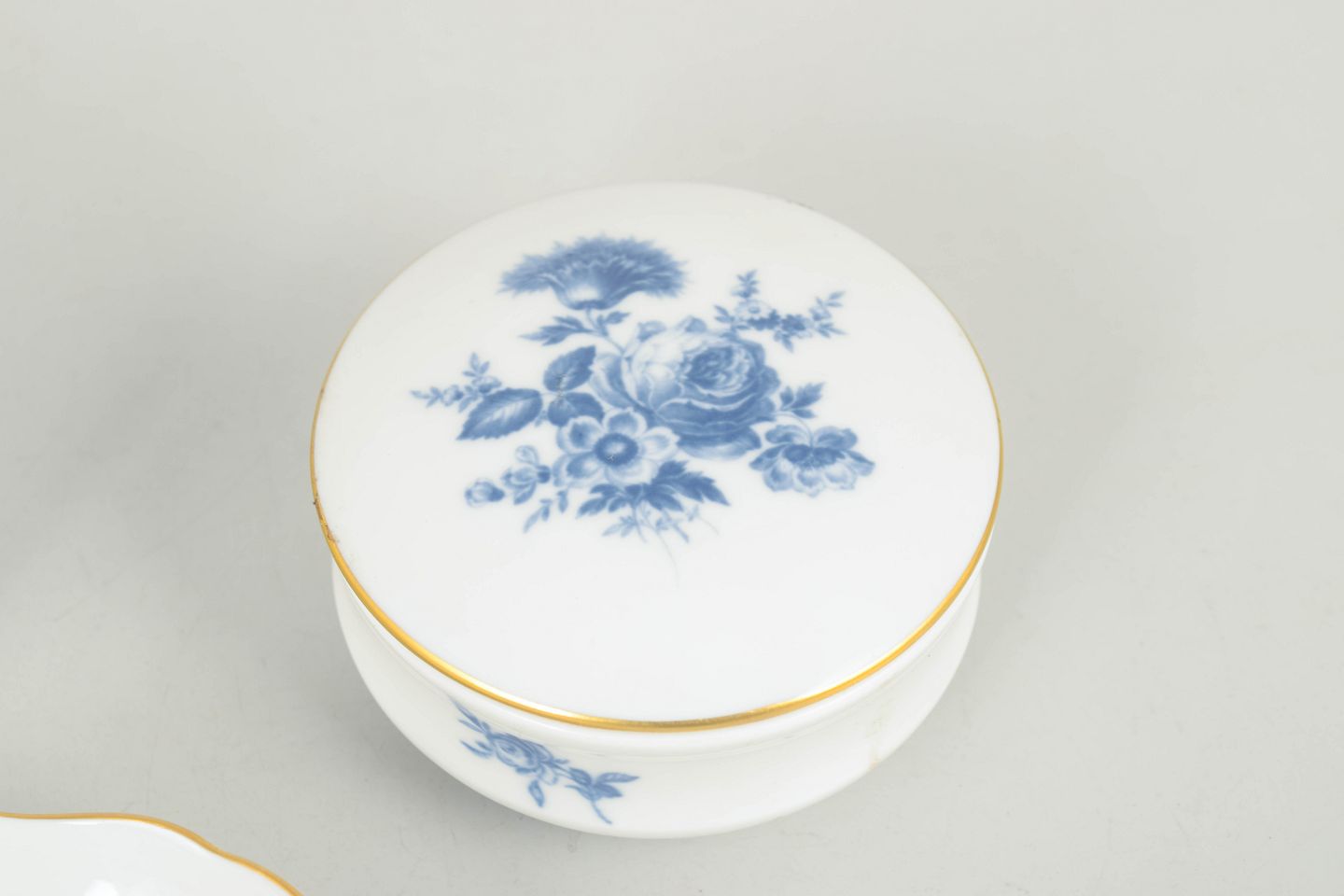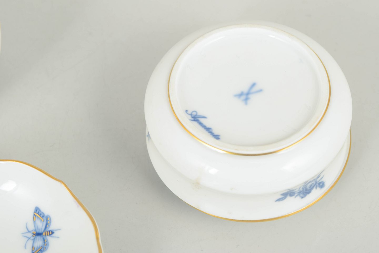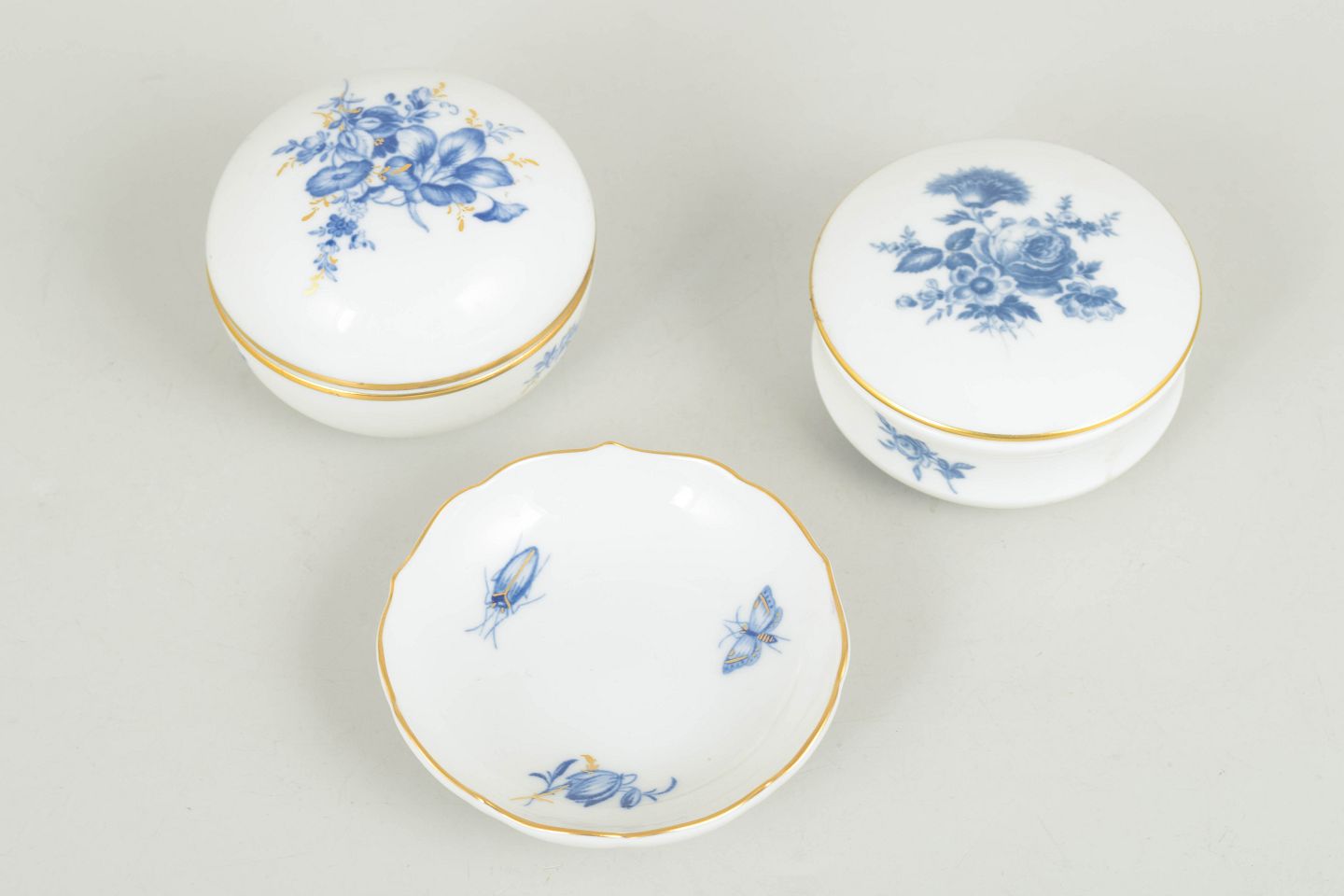 To lågkrukker og en lille skål dekoreret med blomster- og insektmotiver i blå toner med forgyldt kant. Model Aquatinta. Stemplet med Meissens krydsede sværd, 1. sortering.